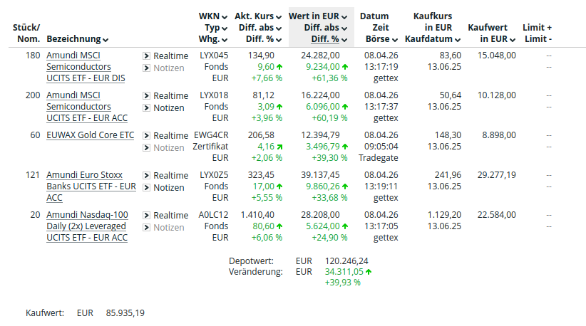 tantchen vor 5 Stunden Da ich seit einiger Zeit weiß, dass ich dieses Jahr mit brauchbaren Sparraten und einem größeren Einmalbetrag einsteigen kann, hab ich mir letztes Jahr Musterdepots angelegt mit ein paar ETFs aber z.B. auch so einem Ding der Börse Stuttgart auf Gold, einen Renten-ETF usw. Da hab ich mir die fiktiven Einstiegspreise von z.B. 2022, Mitte 2024 und 2025 rausgepickt und damit die Depots angelegt. Mittlerweile auch schon Einiges rumgeschoben oder wieder rausgeworfen. Im Musterdeot geht das ja, aber in Echt muss man sich natürlich überlegen, was man wegen Steuern macht. Nur weil ein ETF nicht mehr 30% bringt, sondern nur 5% ist das ja nicht unbedingt ein Grund zur Panik. Dann kauft man eben einen Anderen ein und streut damit im Idealfall auch weiter. So zumindest mal der Gedanke eines Anfängers. Da ich hier anderswo gelesen habe, man solle zunächst mal mit nur 2-3 Posten anfangen, sind diese Depots auch nicht sonderlich riesig und auch die Streuung hält sich in Grenzen. Ich such mir die Dinger immer zuerst nach Performance raus und gucke dann, wie man bisserl besser verteilen könnte. Vor langer Zeit hatte ich mal so superduper Filedity Fonds (in Echt) mit 60% im Jahr... Die waren dann irgendwann halt doch "nur" noch bei 20% und damit im Verlgeich zu den ETF im Musterdepot Rauswurfkandidaten... Hab hier einfach mal zwei Screenshots drangehängt. Bei dem Einen sind zweimal die "gleichen" Amundi ETFS drin, einmal thesaurierend, einmal ausschüttend. Zum Vergleich. Im Übrigen hab ich bei meinem "Plan/Simulation" mit langfristigen Renditen von 8%, 12% und 16% angefangen. Da hatte ich glaub Überschriften wie "Soll", "gut", "sehr gut" drüber ;-) Dazu kam dann später noch die variable Abteilung, in der ich jetzt eben rumspiele, auch mal mit +30% und dann wieder -10% usw... Klar, will ich schnell reich werden... :-D Aber "reich" ist glaub ein dehnbarer Begriff. Ich bin knapp 51 und hab somit noch etwas Zeit bis zur Rente. Nur glaube ich nicht daran, dass ich in 16 Jahren (oder womöglich noch später) aus DEU noch was Nennenswertes an Rente zu erwarten habe. Nach derzeitger Lage gehe ich also davon aus, dass ich nur von meinem Ersparten leben muss. Wo auf der Welt ist noch nicht klar. Das hängt dann vom Budget ab. Es geht also eher um ein Überleben, nicht um ein Luxusleben. Möchte daher eigentlich den renditeorientierten "ich-pfeif-aufs-risiko-Plan noch so ca. 10 Jahre weiterverfolgen und erst dann sehen, wo ich stehe und ob ich dann schon früher in Rente kann oder bis 80 arbeiten muss. Weil entweder, es klappt oder eben nicht. Ein Nasenwässerchen mit immer nur konservativ verdienen - davon hab ich später nix. Und um nochmal auf's eigentliche Thema zu kommen: ich hab inzwischen für die bestehenden zwei ETFs in den Depots bis 2031 das mit den Vorabpauschalen rausgerechnet und komme in einem Beispiel auf Summen von knapp 11.000 EUR Vorabpauschale vs. ca. 71.000 Gewinn (= so wie hier oben mal erwähnt VK-Erlös * 0,7). Klar, Traumrenditen von ca. 30% jährlich, aber darum geht es mir nicht, sondern um das Verhältnis der Werte. Das wären somit gut 2.600 EUR Steuern weniger, wenn ich das richtig sehe... Diesen Beitrag teilen Link zum Beitrag