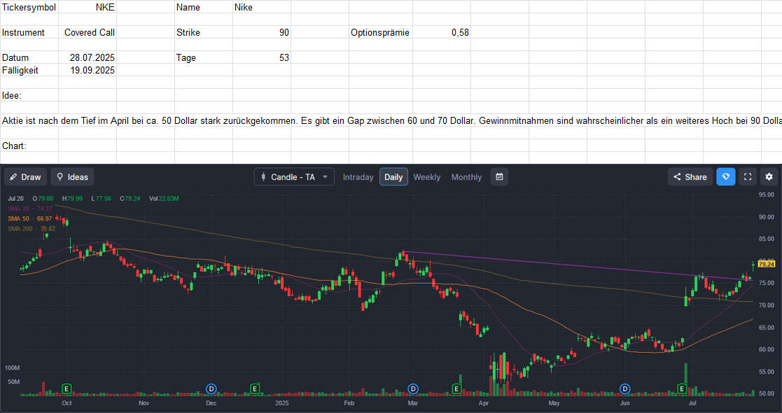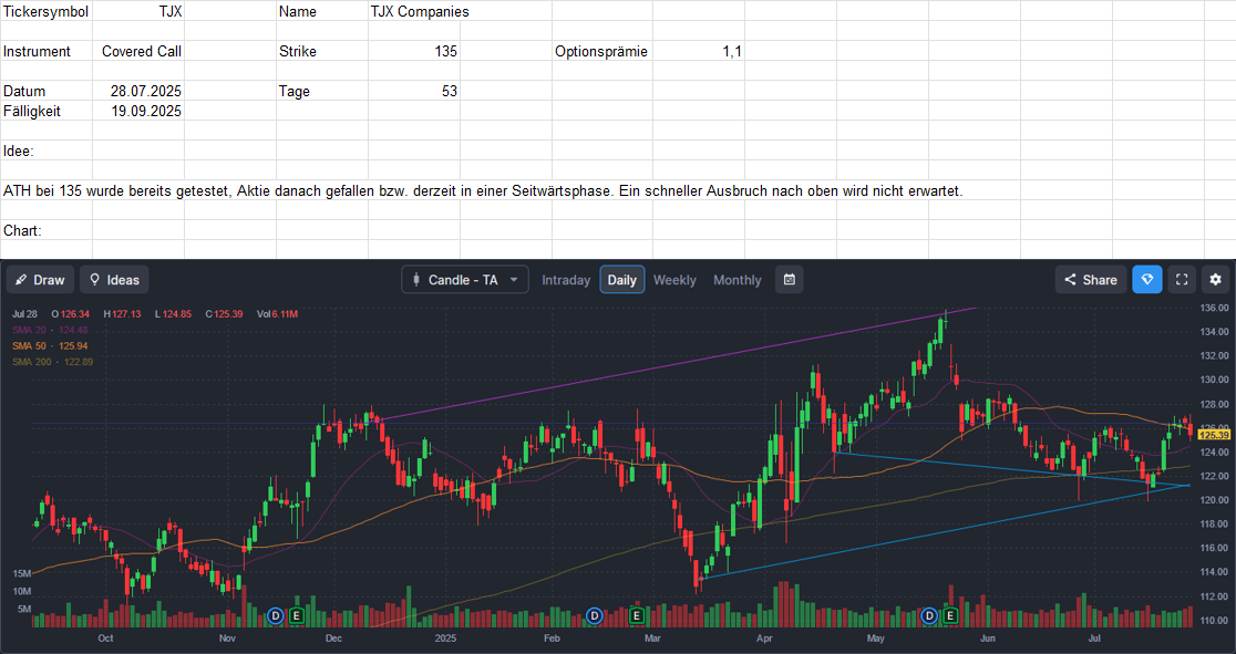 Kezboard 29. Juli · bearbeitet 29. Juli von Kezboard Dollar Hallo zusammen, ab sofort wage ich mich nach umfangreicher Recherche und Einlesen in die Thematik in die Welt der Optionen und möchte meine Depotrendite, die momentan neben Kurssteigerungen hauptsächlich auf Dividenden- und Zinseinnahmen durch Anleihekupons basiert, ein wenig "aufpimpen". Hierzu möchte ich hauptsächlich die Stillhalterposition einnehmen und Covered Calls bzw. Cash Secured Puts verkaufen. Dieser Thread soll als eine Art Tagebuch geführt werden und mir als Nachweis meiner womöglich richtigen oder evtl. auch falschen Einschätzung der Marktsituation dienen. Also hauptsächlich eine Learning Experience für mich selbst. Sollte sich der Basiswert z.B. beim Covered Call dem Strike annähern und ich Gefahr laufen, dass die Aktie ausgebucht wird, müsste ich evtl. die Option rollen. Auch hier habe ich noch keine Erfahrungswerte, der Fall wird aber sicherlich irgendwann eintreten. Cash Secured Puts möchte ich eigentlich hauptsächlich nutzen, wenn ich auch Interesse an einer Aktie habe, mir diese aber im Moment als zu hoch erscheint. Da hier immer die Gefahr besteht, dass eine Aktie eingebucht wird, obwohl man das Cash nicht vorhält, werde ich dieses Mittel vermutlich eher seltener einsetzen. Evtl. werde ich auch beide Strategien in Kombination einsetzen, z.B. wenn eine Aktie, die ich eigentlich halte wollte, nun doch ausgebucht wurde, mir dann über einen Cash Secured Put versuche wieder günstiger ins Depot zu holen. Erste Covered Calls habe ich gestern verkauft, anbei meine ersten Gedanken dazu (man möge mir bei der Beschreibung meiner Idee dahinter nachsichtig sein, aber ich habe keine Ahnung von technischer Analyse und werde erst gar nicht versuchen, irgendwelche Linien in die Charts einzuzeichnen (die u.a. Linien hat Finviz automatisch eingezeichnet)): 20250919_NKE_90: (<YYYYMMDD Fälligkeit>_<Ticker Symbol>_<Strike>) 20250919_RHI_45: 20250919_TJX_135: Das waren erstmal die drei Titel in meinem USD-Depot, bei denen sich Covered Calls angeboten haben. Ich hätte noch weitere potenzielle Kandidaten, aber dort waren die Marktsignale aus meiner Sicht nicht so ganz eindeutig. Wie gesagt - hier fehlt es mir einfach bislang an praktischer Erfahrung. Allen drei Optionen ist gemeinsam, dass ich eine Laufzeit von 53 Tagen ausgewählt habe und den Strike versucht habe, in einem "sweet spot" ca. 10% über dem letzten Schlusskurs zu setzen. Falls hier zukünftig noch weitere Kennzahlen von Belang sein sollten (z.B. die "Griechen" wie Delta etc.), kann ich diese gerne mit angeben. Das soll es dazu auch erstmal gewesen sein. Ich werde die drei Aktien jetzt vermutlich vermehrt im Auge haben und bei Bedarf eingreifen. Updates dann hier! Diesen Beitrag teilen Link zum Beitrag