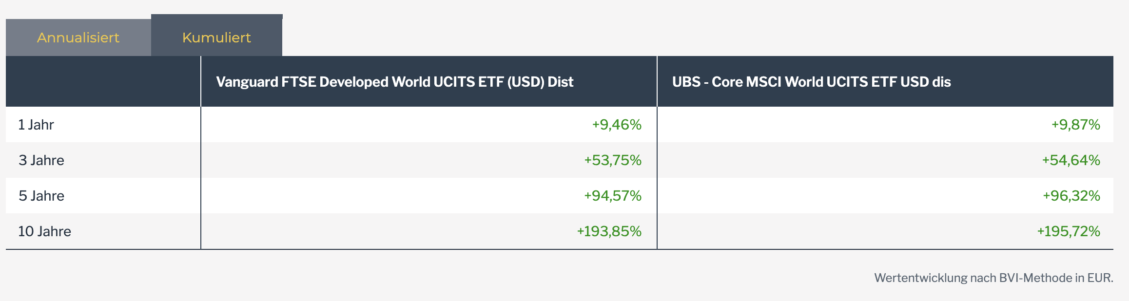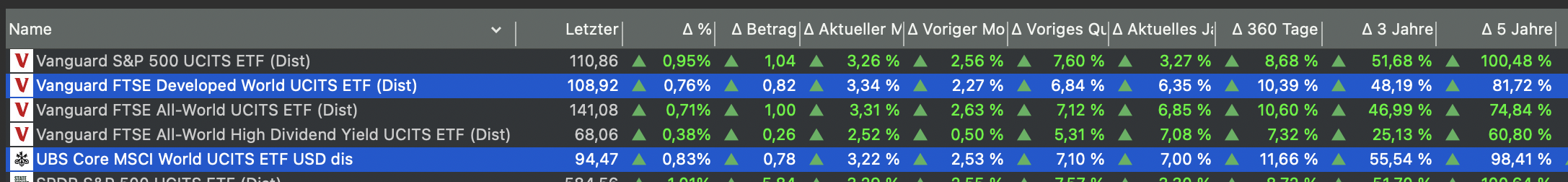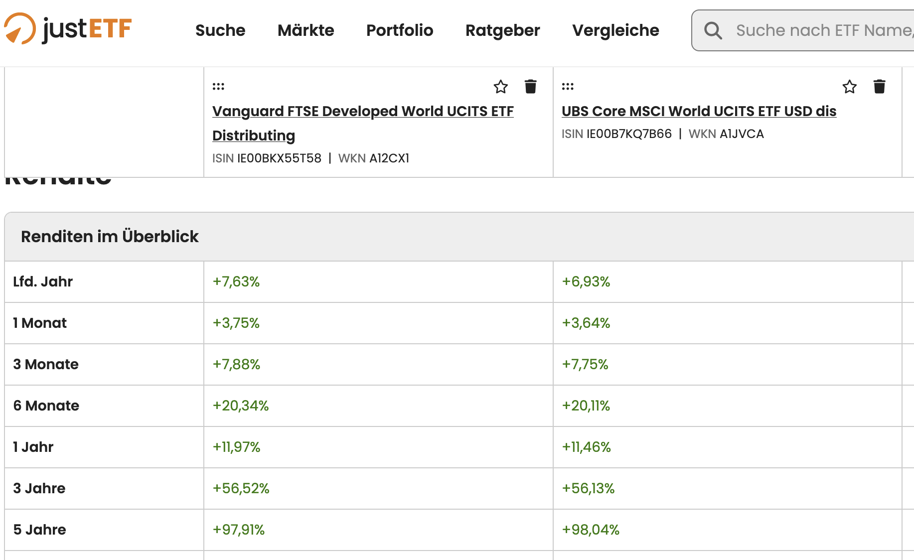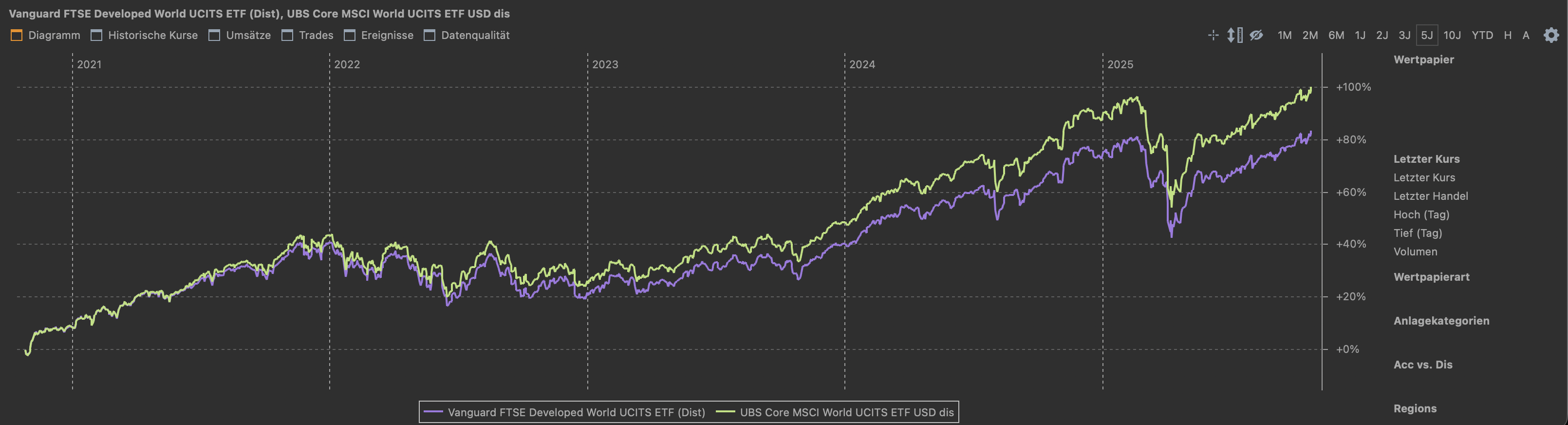 kariya_ANA 25. Oktober Ich vergleiche gerade ein paar ETFs und bin auf folgende Ungereihmtheit gestoßen: Wie erklärt sich die große Diskrepanz der Performance zwischen dem UBS Core MSCI World und dem Vanguard FTSE Developed World bei mir in Portfolio Performance? Die "Einstellungen" hinsichtlich der Datenquelle beider ETFs sind in Portfolio Performance identisch: Yahoo Finance (Adjusted Close). Macht aber auch kein Unterschied, da die Darstellung identisch ist beim PP "Built-in" Kurzlieferservice. Auf ETF-Portalen ergibt sich folgendes Ergebnis, welches ich in PP erwartet hätte: Vielleicht stehe ich auch gerade auf dem Schlauch, aber wäre euch für eure Erklärung dankbar, falls ihr mir erklären könnt, wo hier mein "Denkfehler" liegt. Diesen Beitrag teilen Link zum Beitrag