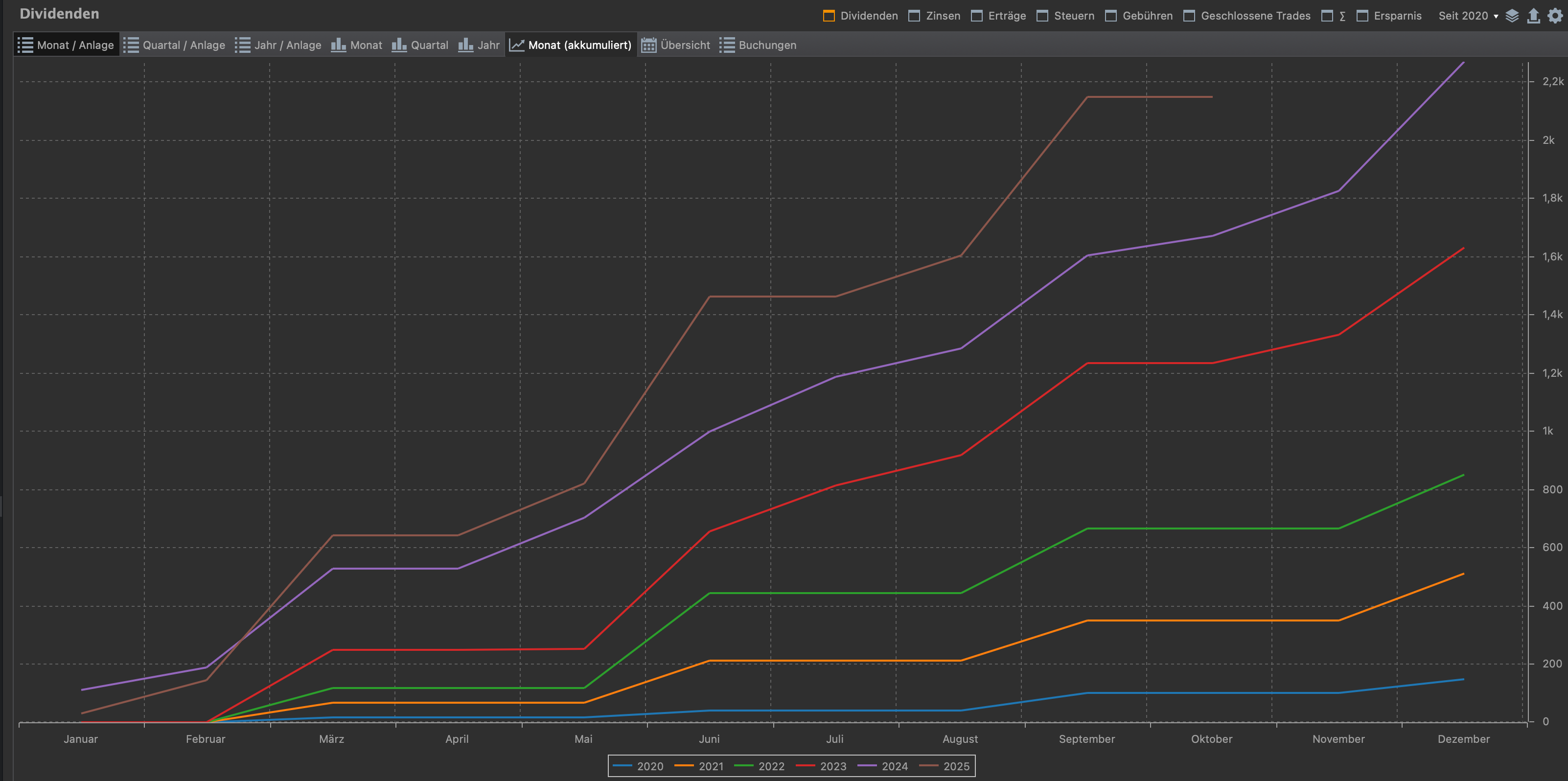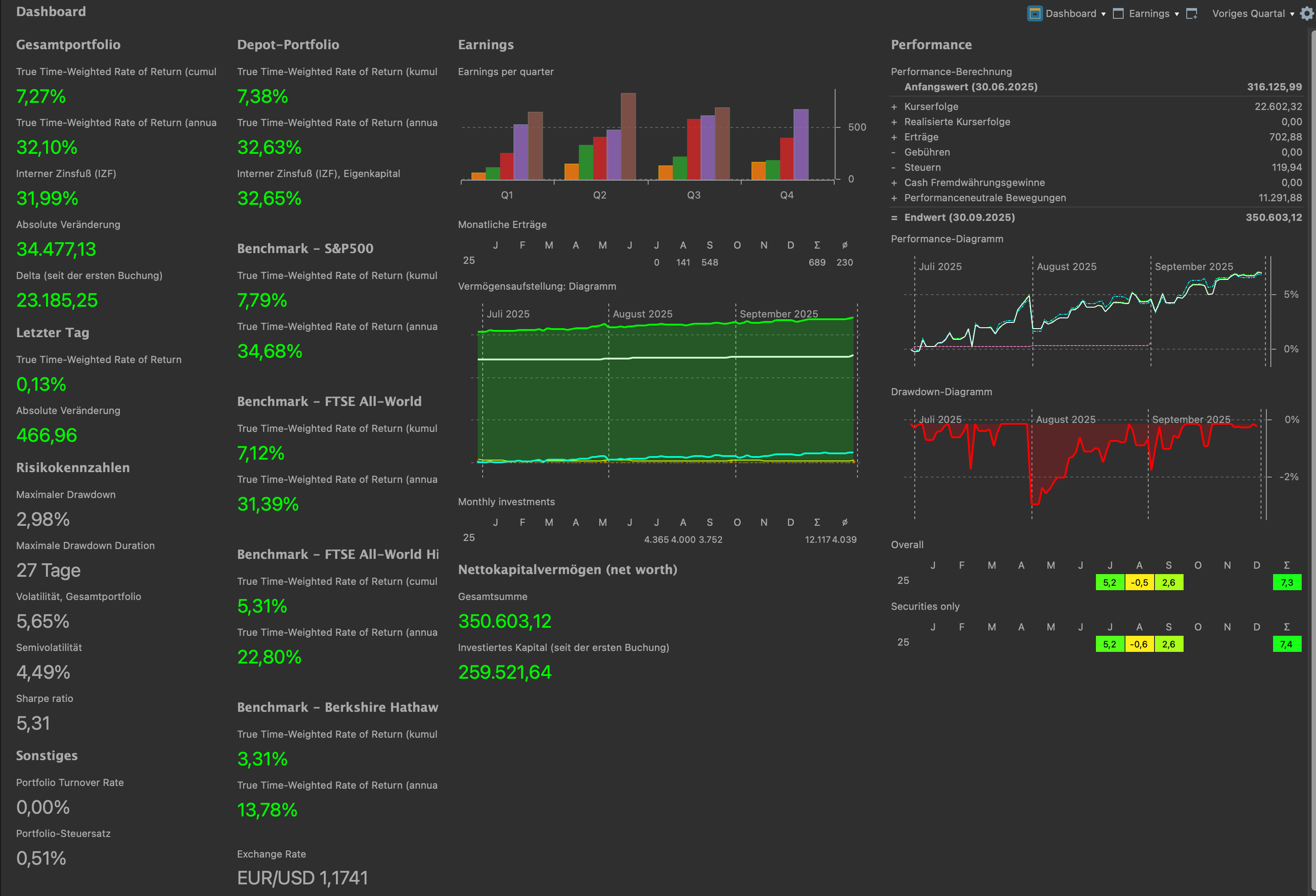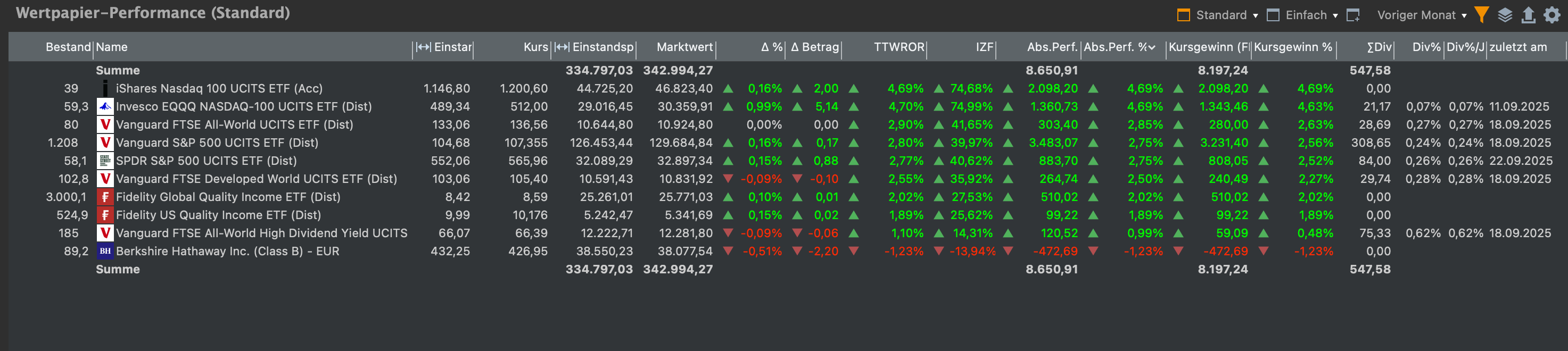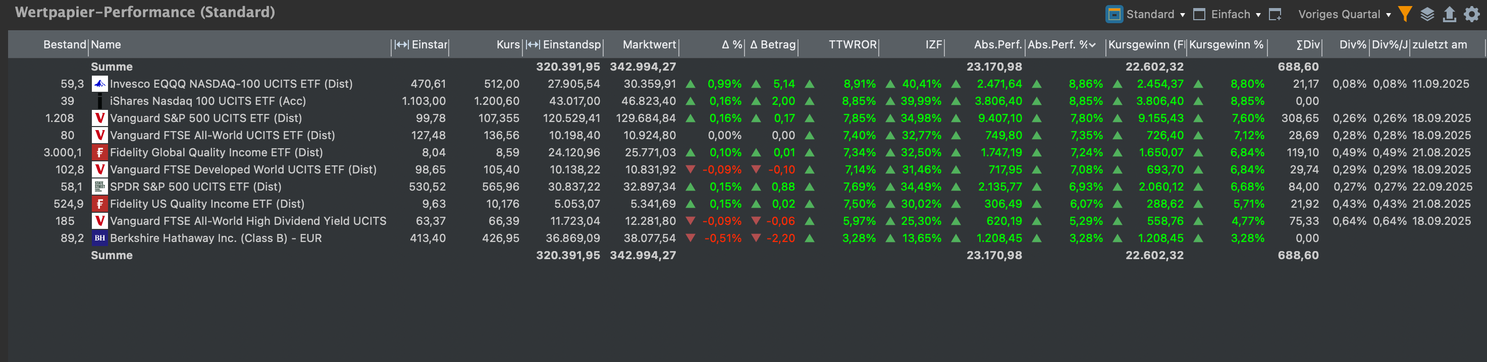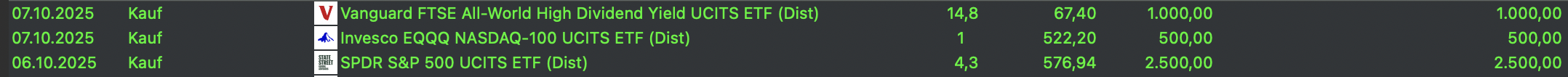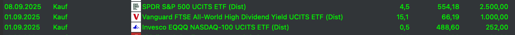 kariya_ANA 7. Oktober Es hat etwas gedauert, aber nun sind alle Dividenden aus dem September eingegangen und sind verbucht. Daher nun das Monatsupdate für September 2025 als auch für das dritte Quartal 2025. Allgemeine Gedanken Aktuell tendiere ich dazu, den SPDR S&P 500 bis Ende des Jahres auf einen Einstandswert von 50.000 EUR zu besparen. Grund ist, dass ich die aktuelle politische Situation genau beobachte und hier etwas mehr geographische Diversifikation anstreben möchte. Es sei jedoch gesagt, dass ich immer noch davon überzeugt bin, dass die USA mindestens die nächste Dekade und ggf. darüber hinaus die führende Weltmacht und Wirtschaft sein werden. Ich bin skeptisch gegenüber EM eingestellt und werde diese nicht separat besparen. Der Anteil aus den FTSE All-World (normal und HD) reichen mir. Folgende Aufteilung ist hierzu vorgesehen: 50% Vanguard FTSE Developed World 25% Vanguard FTSE All-World High Dividend 25 % Invesco EQQQ NASDAQ-100 Der Plan ist jeden ETF bis zu einem Einstandswert von 100.000 EUR zu besparen. Sobald der Vanguard FTSE Developed World voll bespart ist, werde ich den UBS Core MSCI World besparen. Größere Einmalzahlungen (bspw. jährliche Bonuszahlungen) oder Zuflüsse aus Dividenden gehen entweder in den SPDR S&P500 oder den Vanguard FTSE All-World. Dies wird spontan entschieden und was mich gerade besser Schlafen lässt. Update - September 2025 Käufe: Performance: Mit der Performance im September bin ich sehr zufrieden. Es war der beste September seit meinem Investmentstart in 2019 Dividenden: Dividenden werden in der Ansparphase in Brutto dargestellt, um eine bessere Vergleichbarkeit über die Jahre zu gewährleisten. Dividenden werden am Ex-Tag verbucht. Update - Q3 2025 Diesen Beitrag teilen Link zum Beitrag