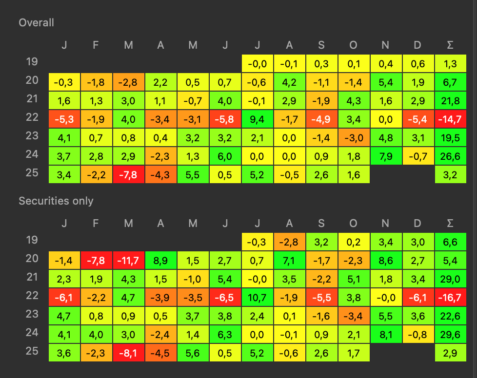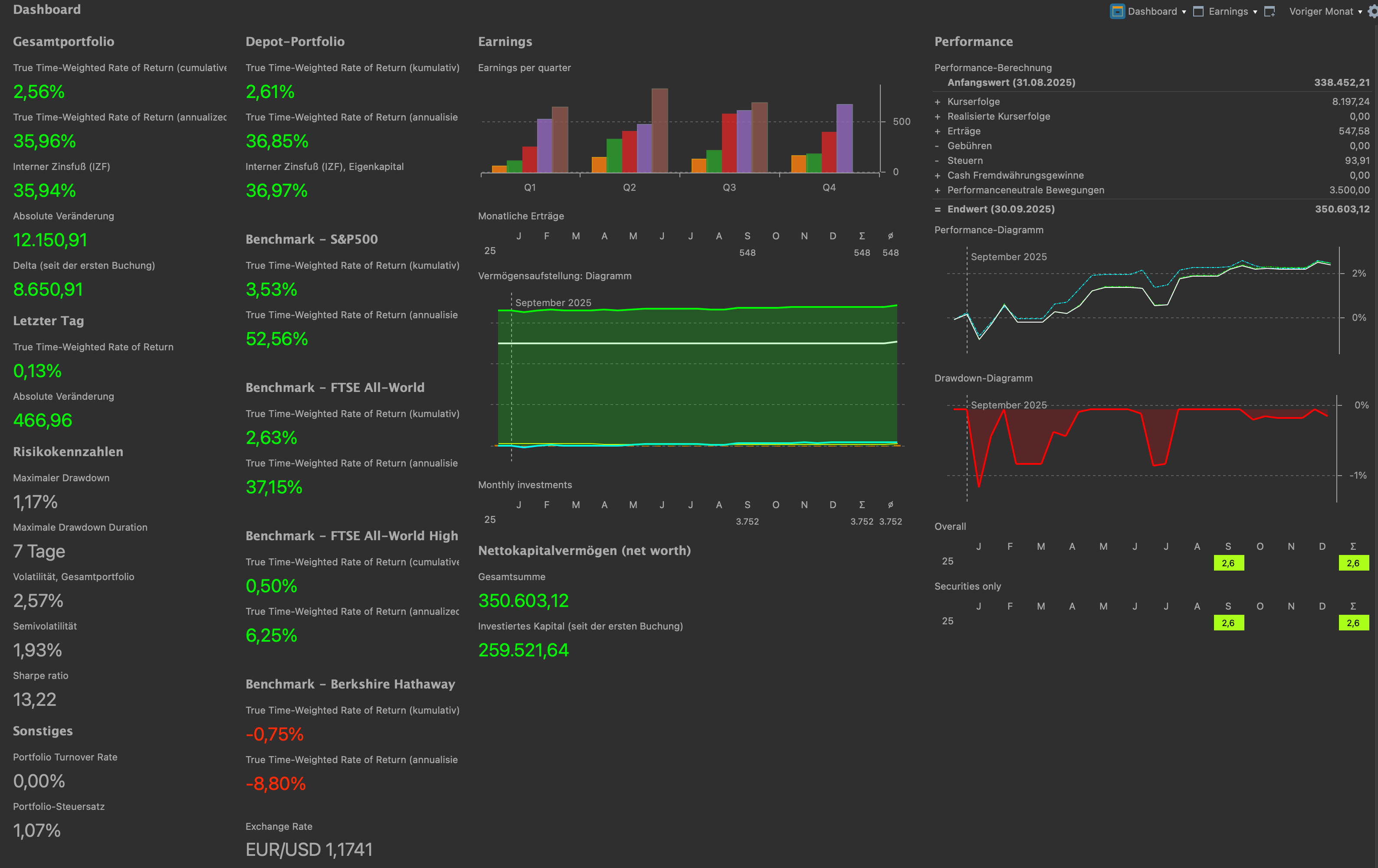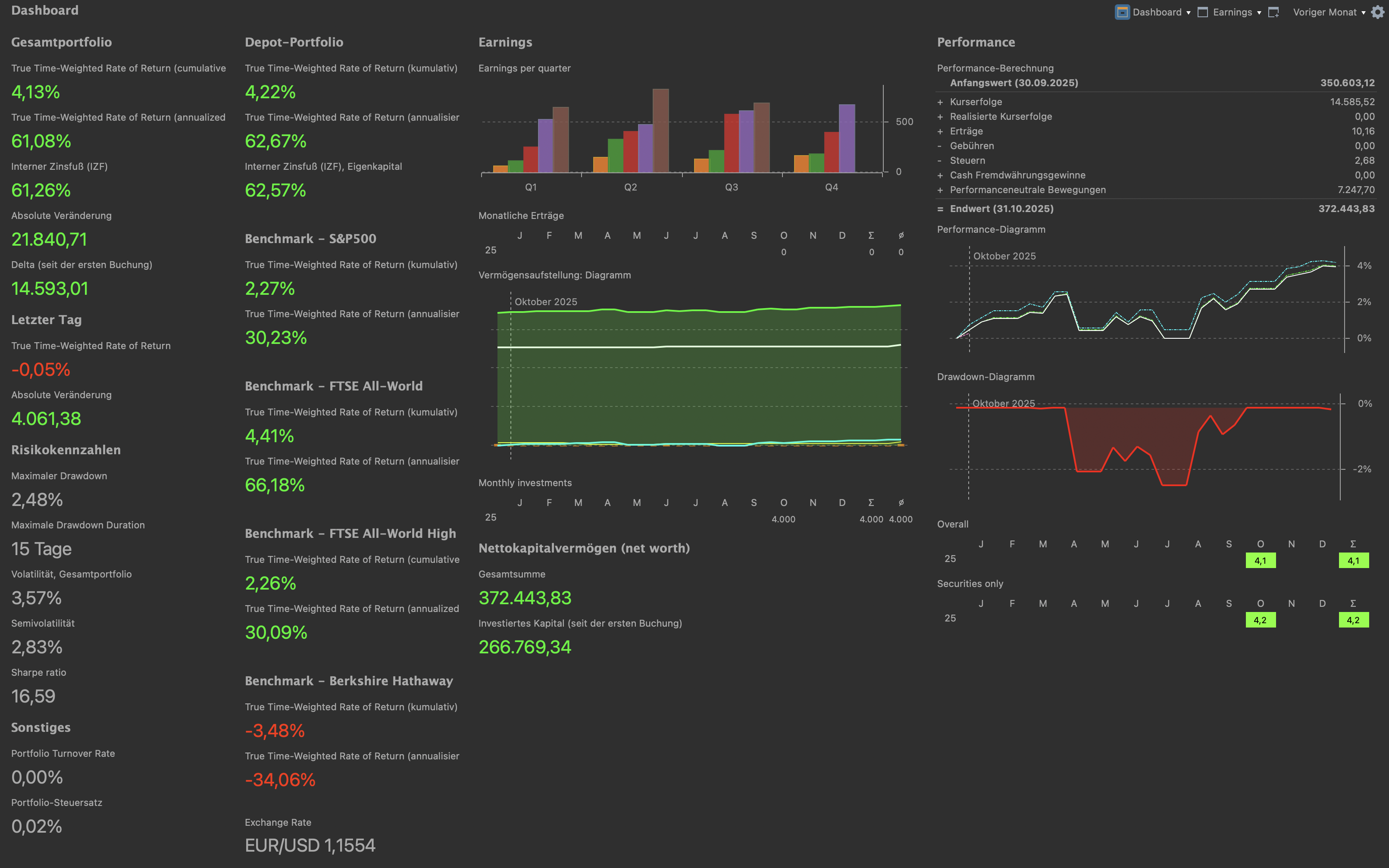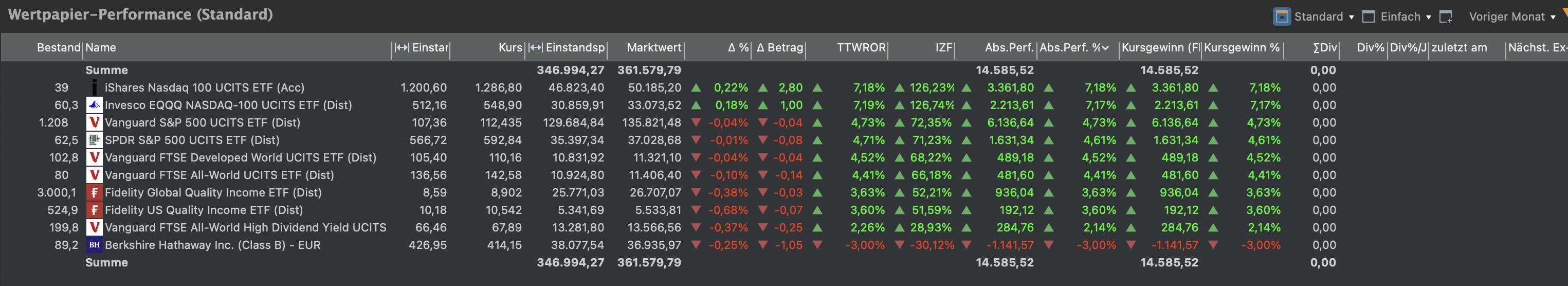 kariya_ANA 1. November · bearbeitet 1. November von kariya_ANA Update - Oktober 2025 Käufe: Performance: Wie schon im September, bin ich mit der Performance im Oktober sehr zufrieden. Ob diese mit der aktuellen Euphorie bei Tech- und KI-Werten nachhaltig ist, kann und wird von einigen hinterfragt. Sicherlich geben die aktuellen "Kooperationen" von Nvidea und OpenAI mit jedem der nicht bei 3 auf den Bäumen ist zu denken. Jedoch halte ich die Investitionen die diese Unternehmen tätigen (gerade bei Microsoft, Amazon, Apple und Co.) für angemessen im Verhältnis zu ihrem Cash Flow und Reserven. Daher sehe ich weniger eine Szenario wie Anfang 2000, welches gerne in Medien bedient wird. Heute, am 1. November 2025, wird es leider so weit sein, dass Warren Buffet seinen letzten Quartalsbericht persönlich veröffentlicht. Der nächste Quartalsbericht im Januar sowie der folgende Jahresbericht erfolgt dann durch Greg Abel. Der Markt scheint Berkshire deswegen wohl über die letzten Monate und Quartale etwas abzustrafen. Auch ein Analyst hat wohl kürzlich Bershire mit dem Status "Underperform" bewertet. Was interessieren mich aber Analysten, um es im Geiste von Warren und Charlie zu sagen. Hierzu auch ein toller Beitrag - wie immer - von Kingswell auf seinem Blog " The Berkshire Beat": https://www.kingswell.io/p/the-berkshire-beat-october-31-2025 Wie auch Kingswell darstellt bin ich gespannt heute zu sehen, ob Berkshire im letzten Quartal Aktienrückkäufe vorgenommen hat. Ich halte den aktuellen Marktpreis, gerade auch aus EU Sicht, für sehr interessant und mich juckt es in den Fingern hier aufzustocken. Einziger Malus ist, dass Berkshire in meinem Portfolio mit Abstand die größte Einzelposition darstellt (ca. 10%). Breche ich die ETFs auf, ist - gem. Parqet x-ray - die nächstgrößere Position mit ca. 6-7% Nvidia und weitere Techwerte. Weitere Gedanken und aktuelle Situation Im Oktober und insb. mit dem nächsten Gehalt Ende November stehen bei mir einige Sondereinkünfte an (Jahresbonus, etc.) Beruflich lief es im letzten Jahr sehr gut, so dass ich von meinem Jahresbonus (Netto) ca. 50-60% Anfang Dezember direkt in das Portfolio fließen lassen werde Ziel: SPDR S&P500 -> Einstandspreis i.H.v. 50.000 EUR (Kauf von ca. 15.000 EUR); der Rest des verbleibenden Kapitals aus dem Bonus soll in den Vanguard FTSE Developed World fließen (Kauf von ca. 6.000 bis 7.000 EUR); sollte es mich zu sehr in den Fingern jucken, gehen alternativ 3.000 bis 5.000 EUR in BRK.B Ab Oktober wurde der monatliche Sparplan standardmäßig auf 4.000 EUR erhöht. Die zusätzlichen 500 EUR sind ca. 40% meiner Nettogehaltserhöhung für das neue Jahr. Die restlichen 60% der Gehaltserhöhung fließen auf ein nicht getracktes Sparkonto für private Käufe und Anschaffungen (u.a. Whirlpool für den Garten nächstes Jahr) Ab Dezember wird, wie im September Update dargestellt, der Sparplan umgestellt: 50% Vanguard FTSE Developed World 25% Vanguard FTSE All-World High Dividend 25 % Invesco EQQQ NASDAQ-100 Aktuell spiele ich mit dem Gedanken bei IBKR ein Depot zu eröffnen und mich damit zu beschäftigen. Es ist nicht geplant, dorthin dann direkt einen Depotübertrag vorzunehmen oder Sparpläne und Käufe auszuführen. Jedoch möchte ich mit ein paar Testkäufen besser die Funktionalität und Service von IBKR verstehen, gerade mit Blick auf die Steuerabwicklung. Hintergrund ist weiterhin, dass ich plane, meine Steuersitz mit Aufgabe der Angestelltentätigkeit in ca. 6-7 Jahren aus Deutschland zu verlagern. Die absolute Unwilligkeit der dt. Politik, unser Steuer- und Sozialsystem zu Gunsten jüngerer Generationen zu reformieren, macht diesen Schritt leider unausweichlich. Ebenfalls denke ich darüber nach in ca. 4-5 Jahren physische Goldreserven i.H.v von ca. 5-10% des Gesamtdepotvolumens anzulegen (vss. 50.000 bis 100.000 USD). Diese sollen dann als Notgroschen fungieren, neben Bondinvestments i.H.v. gemittelten 2-3 Jahresausgaben. Ich würde mich freuen, falls ihr interessante, seriöse und praxisrelevanten Quellen oder Literatur zum Thema "Vermögensauswanderung", Steuern, etc. habt und empfehlen könnt. Gerne auch mit Blick zu einem Leben im Luxuscamper (incl. Motorrad ;)) oder auf einem Boot "ohne festen Wohnsitz". Diesen Beitrag teilen Link zum Beitrag
