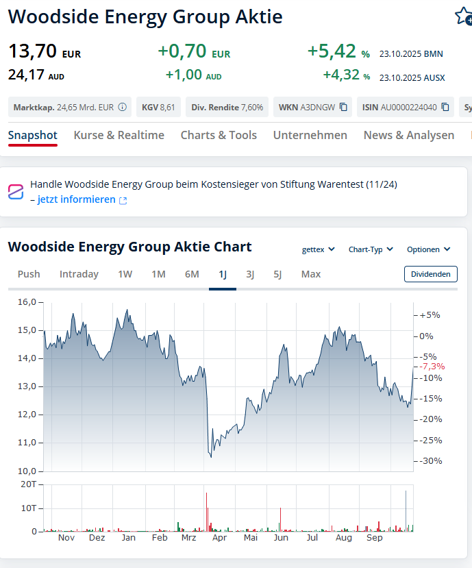 Cai Shen 24. Oktober Wer will wo 1,5 Mrd. investieren? Wenn du dein (wahrscheinlich) hart erarbeitetes Geld irgendwo reinwirfst, solltest du zumindest einen Plan haben, wie die Moneten vermehrt zurückkehren. Zitat Fitch Ratings – Sydney/Hongkong – 26. September 2025 Fitch Ratings hat das langfristige Emittentenausfallrating (Long-Term Foreign-Currency Issuer Default Rating, IDR) der in Australien ansässigen Woodside Energy Group Ltd. mit „BBB+“ bestätigt. Der Ausblick ist stabil. Das IDR von Woodside spiegelt seine Position als größter Öl- und Gasproduzent Australiens wider, mit erheblicher Exponierung gegenüber langfristigen LNG-Verträgen (verflüssigtes Erdgas) und inländischen Gasmärkten, die Einnahmesicherheit bieten. Das Unternehmen verfügt über eine solide nachgewiesene (1P) Reservebasis, die geografisch über Australien, Senegal, den Golf von Mexiko und Timor-Leste diversifiziert ist. Die Bewertung wird teilweise durch den begrenzten operativen Umfang und die geringere vertikale Integration im Vergleich zu höher bewerteten Wettbewerbern eingeschränkt. Der stabile Ausblick wird durch Woodsides konservative Kapitalstruktur gestützt, mit einem EBITDA-Netto-Verschuldungsgrad von 0,7x zum Dezember 2024. Dies bietet einen komfortablen Puffer auf dem Niveau von „BBB+“, um die Erweiterung der Projektpipeline zu unterstützen. Fitch erwartet, dass Woodside weiterhin einen vorsichtigen Ansatz und eine Kapitalstruktur beibehält, die einer Investment-Grade-Bewertung entspricht. ________________________________________ Wichtige Bewertungstreiber Ausreichender Verschuldungsspielraum: Fitch prognostiziert, dass Woodsides EBITDA-Netto-Verschuldung in den Jahren 2025–2026 solide bei 1,0x–1,1x bleiben wird (2024: 0,7x), trotz der geplanten Investitionen in das 16,5 Millionen Tonnen pro Jahr (mtpa) umfassende Louisiana LNG-Projekt sowie fortschreitender Investitionsausgaben für Scarborough und Trion. Für das Louisiana LNG-Projekt wurde eine endgültige Investitionsentscheidung (FID) getroffen, mit einem Gesamtbudget von 17,7 Milliarden USD. Der Rating-Puffer ist ausreichend, da die prognostizierte EBITDA-Netto-Verschuldung deutlich unter der negativen Schwelle von 2,0x liegt. Das Unternehmen wird einen Teil der Investitionsausgaben für Louisiana LNG durch den Verkauf eines 40%-Anteils an Louisiana LNG Infrastructure LLC an Stonepeak in Höhe von 5,7 Milliarden USD finanzieren. Dieser Erlös wird voraussichtlich rund 75 % der Projektkosten in den Jahren 2025–2026 abdecken. Aggressive Wachstumsstrategie: Woodsides zwei große Wachstumsprojekte in den USA – das Louisiana LNG (16,5 mtpa) und das Beaumont New Ammonia (1,1 mtpa) – werden den Umfang und die Diversifizierung des Unternehmens erhöhen. Allerdings belasten diese Projekte das Rating, da sie ein höheres Risikoprofil als Woodsides bestehende Anlagen aufweisen – insbesondere durch stärkere Abhängigkeit von der Volatilität der Rohstoffmärkte und potenziell geringere Margen zwischen Henry Hub und den Gaspreisen TTF/JKM. Verschuldung empfindlich gegenüber Brent-Preis: Woodsides Verschuldung könnte sich verschlechtern, falls der Brent-Rohölpreis stärker als erwartet fällt, da das Unternehmen weiterhin hohe Investitionsausgaben für US-Projekte sowie für Scarborough und Trion plant. Fitch schätzt, dass die EBITDA-Netto-Verschuldung die negative Schwelle von 2,0x überschreiten könnte, wenn der Brent-Preis 10–15 USD/Barrel unter dem Fitch-Preisrahmen liegt. Allerdings könnte Woodside durch den weiteren teilweisen Verkauf von Projektanteilen (und Verwendung der Erlöse zur Senkung der Investitionsausgaben) das Rohstoffpreisrisiko abfedern. Größe und Diversifikation: Woodside ist im Vergleich zu seinen Wettbewerbern gut aufgestellt – mit 1P-Reserven von 2,0 Milliarden Barrel Öläquivalent (boe) Ende 2024 und einer durchschnittlichen Produktion von etwa 530.000 boe pro Tag im selben Jahr. Australien machte über 65 % der Umsätze aus, doch dieser Anteil dürfte mit zunehmender Produktion aus internationalen Projekten – wie Senegal Oil, Beaumont New Ammonia und Louisiana LNG – allmählich sinken. Gas bleibt Hauptumsatzträger: Fitch erwartet, dass Gas weiterhin den größten Anteil an der Produktionsmenge haben wird, trotz eines Rückgangs auf etwa 60 % in den Jahren 2025 und 2026 (2024: etwa 67 %), bedingt durch den Start der Ölförderung bei Sangomar. Woodsides hohe Gasexponierung trägt erheblich zu seiner im Vergleich zu Wettbewerbern hohen Cash-Netto-Marge bei, die 2024 etwa 75 % betrug. Gaseinnahmen sind auch stabiler als Öleinnahmen, da LNG und inländisches Gas typischerweise über langfristige Verträge mit Preisbindung an Rohöl oder festgelegten Preissteigerungen verkauft werden. Wachsende Projektpipeline: Fitch berücksichtigt geschätzte Investitionsausgaben für Woodsides genehmigte Projekte, darunter Scarborough, Trion und Louisiana Phase 1. Nicht berücksichtigt sind mögliche zukünftige Projekte, die zwischen 2026 und 2027 eine FID erreichen könnten – wie Louisiana LNG Phase 2, Beaumont New Ammonia sowie Investitionen in neue Energie- und Dekarbonisierungsprojekte. Fitch bewertet Zeitpunkt, Budget und Eigentumsanteil dieser Projekte als ungewiss und würde eine FID als „Ereignisrisiko“ einstufen. Fähigkeit zur Monetarisierung von Investitionen: Fitch geht davon aus, dass die Verkaufserlöse aus Woodsides jüngsten Transaktionen – einschließlich der Anteilsverkäufe an Scarborough und Louisiana Infrastructure – den Großteil der kurzfristigen Investitionen in den Jahren 2025–2026 decken werden. Zudem erwartet Fitch, dass Woodside weiterhin Beteiligungen veräußern wird, wenn zusätzliche Finanzierung erforderlich ist – einschließlich eines möglichen weiteren Verkaufs von bis zu 50 % an Louisiana LNG Holdco vor Beginn der zweiten Projektphase. Steigende regulatorische Risiken: Fitch hält die derzeitigen regulatorischen Risiken für beherrschbar, beoba