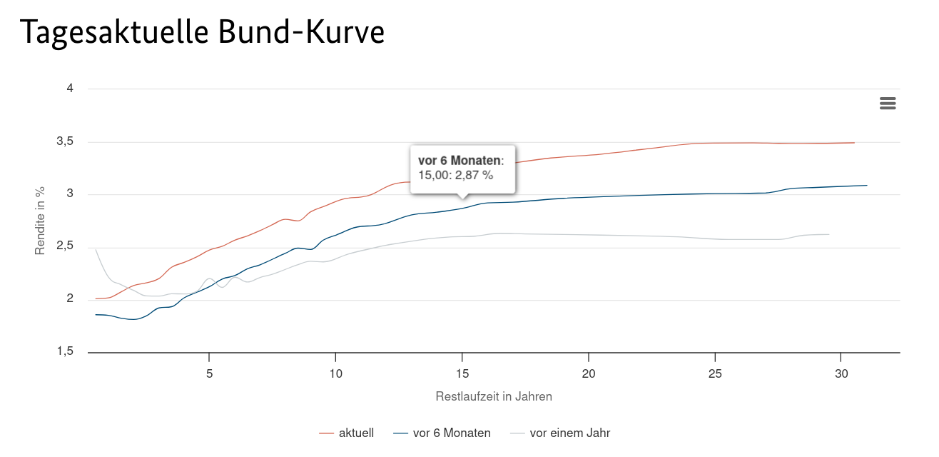 PKW Dezember 27, 2025 Am 23.12.2025 um 18:39 von stagflation: Für einen Anleger, der 5 Jahre anlegen will, muss die erwartete Rendite ungefähr gleiche sein - ganz gleich, ob er in Tagesgeld, 1-jährige, 3-jährige, 5-jährige oder 7-jährige Bundesanleihen investiert. Das war bezogen auf die Zinskurve vor 2 Jahren, oder? Die aktuelle Zinskurve (rot) sieht so aus Bei einer "normalen" Zinskurve wird eine 5-jährige Anlage im Geldmarkt eine niedrigere Rendite erzielen wie die (ebenfalls 5-jährige) Anlage in eine 5-jährige Bundesanleihe. Gleiche Rendite (oder gar höhere Rendite im Geldmarkt) passiert nur bei einer inversen Zinskurve. Diesen Beitrag teilen Link zum Beitrag