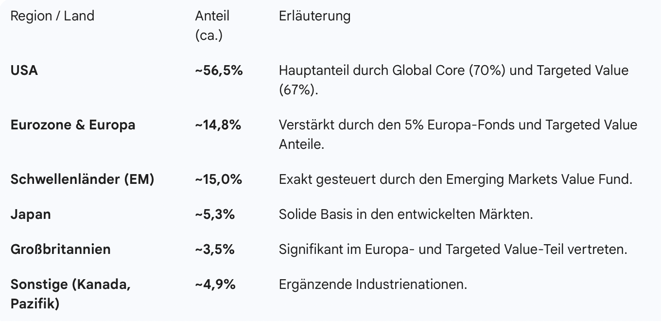 Regionale Verteilung: Dein Dimensional-Mix spiegelt durch die manuelle Gewichtung (20% Europa / 22% EM) die Länderverteilung wider, die der WELT0A automatisch einnimmt.