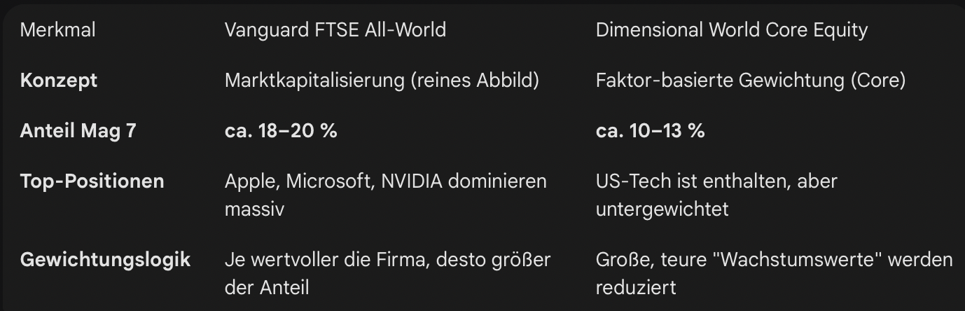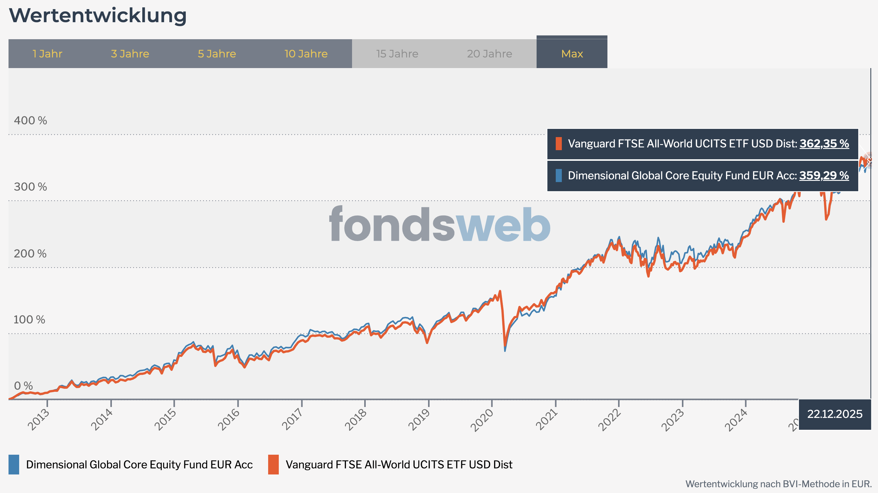 Im Grunde ist es natürlich richtig, dass Indexfonds wie der Vanguard FTSE All-World kosteneffizienter wären, wenn mehr opportunistische Flexibilität erlaubt wäre. Und ein grosser Fehler ist der Dimensional Fund sicher nicht, wenn der Endgegner das Tagesgeld ist.