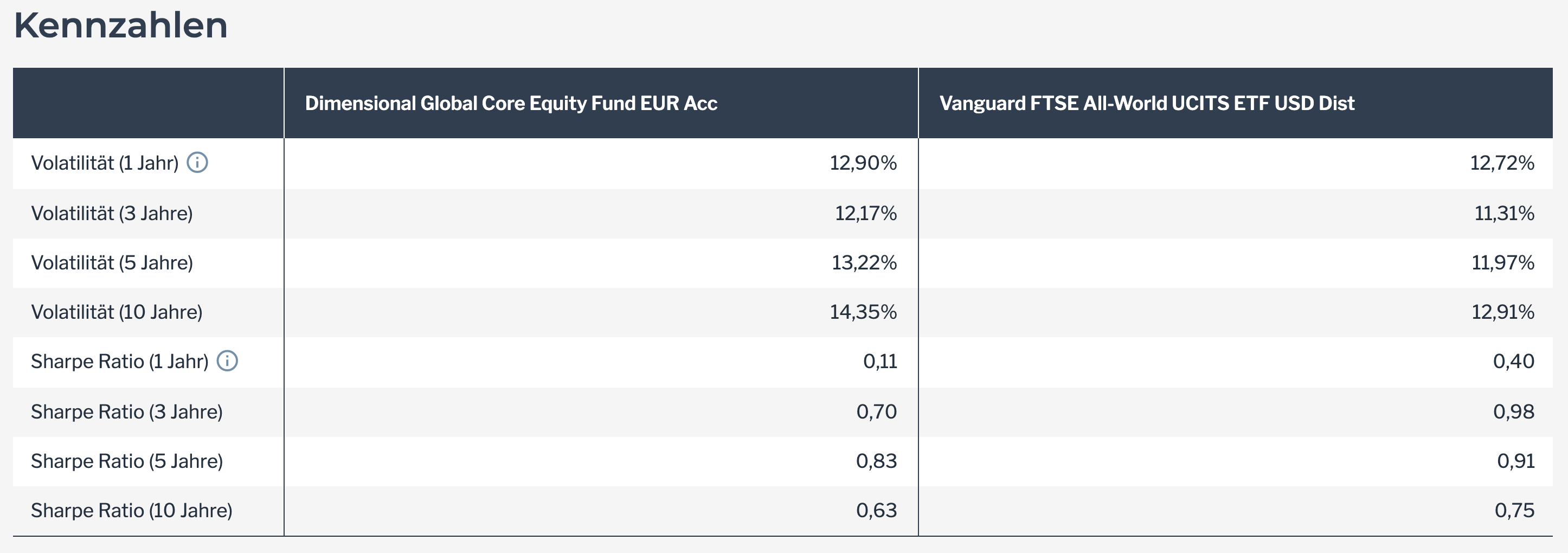 Allerdings sehe ich nicht, dass sich die ausgeklügelte Methodik in der Rendite der letzten fast 13 Jahre (maximaler Zeitraum) niedergeschlagen hätte. Tatsächlich hat der Vanguard FTSE All-World gegenüber dem Dimensional Global Core Equity Fund die Nase leicht vorne, was Rendite, geringere Volatilität und Sharpe Ratio angeht:
