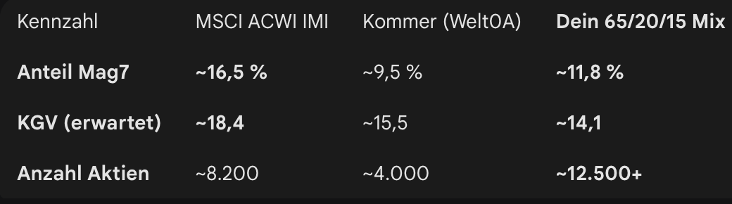 Sonst könnte man nämlich auch den ARERO Weltfonds nehmen, der im Aktienanteil nicht nach MCAP anlegt, und noch über zwei weitere Assetklassen diversifiziert, wenn einem dieses Thema wichtig ist.