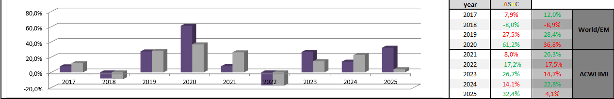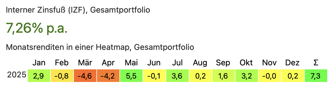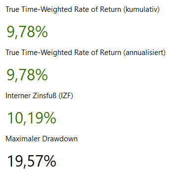 Euronensammler vor 6 Stunden · bearbeitet vor 6 Stunden von Euronensammler Depot-Ergebnis 2025: Aktien 47% HY-Bonds 15% EM-Bonds 15% IG-CorpBonds 20% IG-Bonds 3% Geldmarkt 0% ---------------- 100% Entnahmephase mit Rente. ca. 95% in ETFs. ca. 45% in USD. IZF 7,2%. MaxDD in '25: 11,7% Daneben noch eine alte KLV; nicht in Performance-Zahlen berücksichtigt. Der schwächelnde Dollar hat gebremst. Mit dem positiven IZF ergab sich trotz Entnahmephase noch ein Vermögenswachstum. Bin zufrieden. Diesen Beitrag teilen Link zum Beitrag