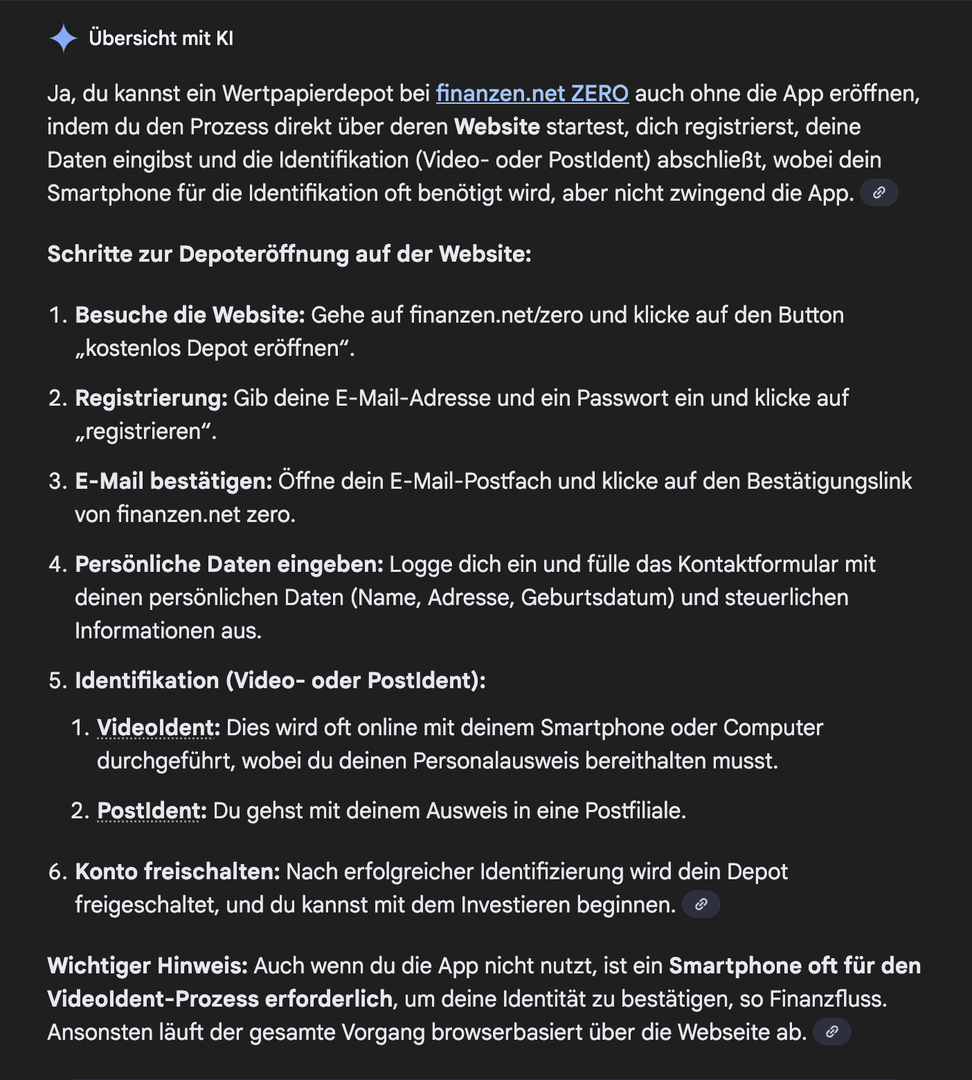 mique vor 18 Stunden · bearbeitet vor 8 Stunden von mique vor 17 Stunden von Marco_: Ich dachte schon, dass mit finanzen.net zero eine weitere Lösung gefunden wäre, doch leider sagt die KI: […] hmm…… ’will Dir nicht widersprechen – vielleicht stimmt ja die zuletzt genannte KI-Antwort – aber ich wundere mich, wie unbekümmert hier im Forum irgendwelchen KI-Ergebnissen vertraut wird. Warum sollte die von @No.Skill zitierte Antwort (Grok) weniger richtig sein, als die von Dir angeführte? Ich spreche das an, weil ich aus Interesse einfach mal gegoogelt habe und erhielt, ebenfalls KI-generiert, zwei Antworten, die finanzen.net ZERO ohne App/Smartphone eindeutig grünes Licht geben… Stimmen diese? - Keine Ahnung. Sicher wüsste das nur jemand, der dort selbst diesbezüglich praktische Erfahrung hat, bzw. auf Anfrage eine vertrauenswürdige Antwort des fnZERO-Supports. Witzigerweise schreibt finanzen.net ZERO auf der eigenen Webseite in ihrer FAQ-Sammlung unter der Rubrik "Sicherheit+Datenschutz" > Secure TAN App: Ob diese Info nun tatsächlich aktuell und verlässlich ist? - Auf mich wirken die unterschiedlichen, sich teilweise widersprechenden Inputs jedenfalls verunsichernd, so daß ich im finanzen.net ZERO-Thread suchen, bzw. mal vorsichtig nachfragen würde, wenn dieser Broker in der engeren Wahl stünde… Diesen Beitrag teilen Link zum Beitrag