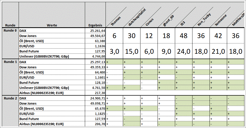 Thomas Freitag um 21:25 Hallo zusammen, eine weitere Börsenwettrunde beginnt. Viel Spaß beim Wetten. Tippabgabe bis Montag 17:00 Uhr --> 3. Runde von 11 Runden. Neue Startwerte und Veränderung aus der letzten Runde: 1. DAX: 24900,71 (-) 2. Dow Jones: 49098,71 (-) 3. Öl (Brent, USD): 65,67 (+) 4. EUR/USD: 1,1825 (+) 5. Bund Future: 127,59 (-) 6. Airbus (NL0000235190; EUR): 206,7 (-) 6. (Neu) BYD (CNE100000296; HKD): 99,6 Informationen: Erst Tippabgabe! Danach können weitere Beiträge verfasst werden. Anders herum wird disqualifiziert! Die ersten 5 Werte stehen während der ganzen Tippsaison fest. Der 6. Wert wechselt von Runde zu Runde. Vorschläge für einen 6. Wert werden jederzeit entgegengenommen. Es dürfen jederzeit auch neue Spieler einsteigen und sich am laufenden Spiel beteiligen. Regeln: https://www.wertpapier-forum.de/topic/368-regeln-und-informationen-für-die-börsenwette/ Fragen: https://www.wertpapier-forum.de/topic/1420-fragen-zur-börsenwette-hier-rein/ Bitte die Tipps im vorgegebenen Format abgeben! So sieht der richtige Code als Beispiel aus: [hide ] (hier das Leerzeichen noch entfernen vor "]") 1. + 2. - 3. - 4. + 5. + 6. - [/hide] Ich hab's mal wieder drauf als Kontraindikator. Mein Tipp: Versteckter Inhalt Du kannst den versteckten Inhalt sehen, sobald du auf dieses Thema antwortest. Diesen Beitrag teilen Link zum Beitrag