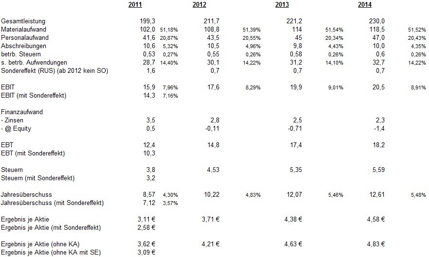 Stairway März 28, 2011 Hallo Plutus, Wurde was zu den (finanziellen) Auswirkungen steigender Preise (Rohstoffe, Energie, etc.) gesagt und was hast du bei deiner Vorschau auf die nächsten Jahre unterstellt? Zum 1.3 bzw 1.4 wurden/werden die Preise um bis zu 5,5% erhöht. Das konnte man je nach Abnehmersparte verschieden stark durchsetzen. Dadurch ist erstmal ein bisschen Luft, da die Inputpreise bisher noch stabil waren. Das kann sich, gerade was Energie angeht, aber auch wieder ändern. Wie du in meiner Tabelle siehst, gehe ich bei der Materialaufwandsquote von einem leichten Anstieg über die nächsten Jahre aus. Das liegt daran, dass man nun eben eine Preiserhöhung durchgesetzt hat und diese sich dann in den nächsten Jahren relativiert. Sieht das Management Möglichkeiten die höheren Kosten durch höhere Preise an die Kunden weiterzugeben? s.o. Du musst aber bedenken, dass die Kapazitäten erst bei einem Umsatz von rund 210 Mio. voll ausgelastet sind, da wird man also einen Rückgang erreichen, wie du an der Quote der "sonst. betrieb. Aufwendungen" siehst. Auch bei dem Personalaufwand wird man ähnliches beobachten, da ASC in der Krise die eigenen Mitarbeiter behalten hat, weil man keinen Humankapitalabfluss wollte. D.h. höhere Kapazitätsauslastungen sind hier gut für die Marge. Wurde was zur Branchenentwicklung (weitere eigene Akquisitionen oder Konsolidierung in der Branche) gesagt? Steht mit Sicherheit keine an. Es werden nun 7 Mio. in Frankreich für den Minderheitsanteil und 13 Mio. in Russland benötigt, da ist kein Platz für eine Übernahme und auch keine Notwendigkeit aktuell. Die anderen Hersteller sind einfach zu unrentabel. Beste Grüße Diesen Beitrag teilen Link zum Beitrag