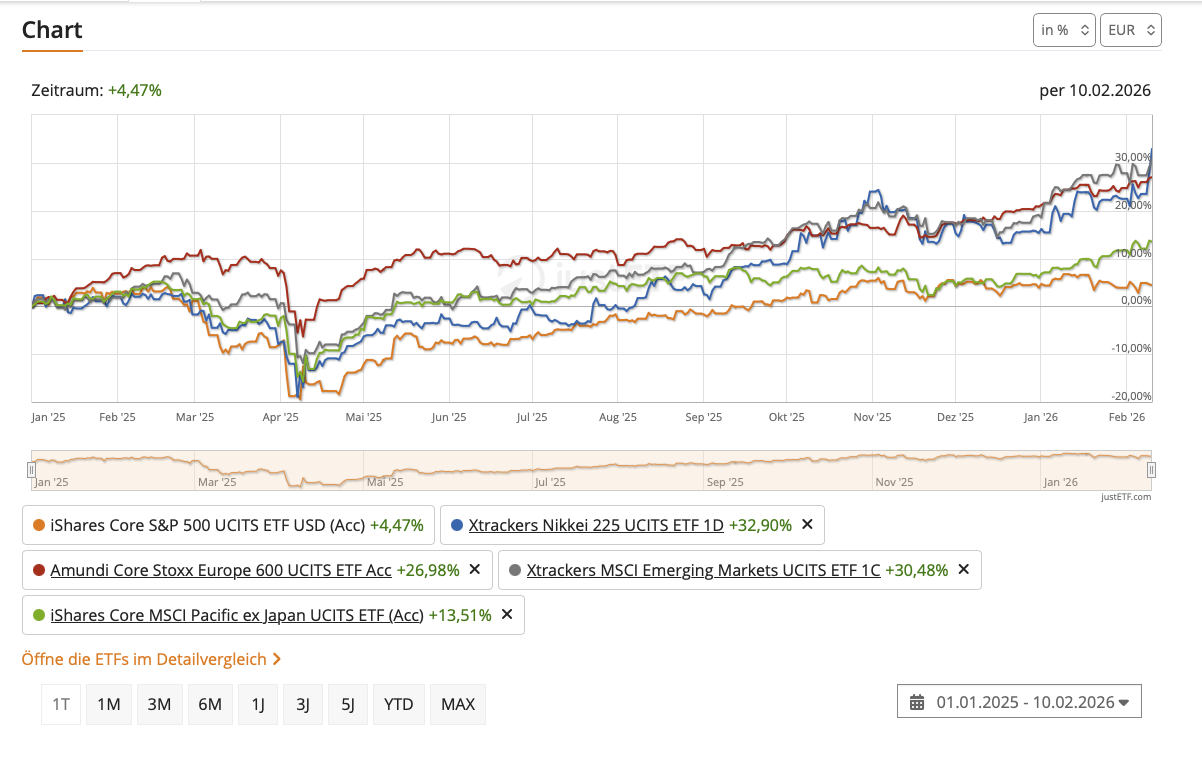 cutter111th 11. Februar · bearbeitet 11. Februar von cutter111th Muss jeder selbst wissen wie er gewichtet. In einem der Threads hier gab es doch mal ein Video in welchem aufgezeigt wurde, dass man auf lange Sicht eigentlich mit so ziemlich jeder Variante MCAP geschlagen hat. Klar, die Periode seit der Finanzkrise hat das nicht funktioniert, aber eventuell war diese 0-Zins-Phase im Rückspiegel auch nur eine Anomalie. Zumindest sehen wir seit der Zinswende schon, dass sich gravierend etwas geändert hat. Man kann durchaus sagen, dass sich im Umfeld immer weiter steigender Zinsen wieder eine Normalisierung einstellt und die Zinsen vor allem am langen Ende steigen wo man hinschaut. Schon sehen wir auch eine nun schon länger anhaltende Value-Phase, auch dass der Dividend Leaders seit 2022 so deutlich outperformt kommt nicht von irgendwoher. Ebenso sehen wir schon seit 2025 eine sehr krasse Underperformance der USA, welche sich zumindest im noch jungen Jahr 2026 bisher weiter sehr deutlich verschärft hat, vor allem in Kombination mit der Dollar-Schwäche. Das war übrigens in den 0er Jahren auch schon mal so und mit ein Grund für die lange Durststrecke von MCAP. Aktuell läuft eigentlich alles mit Ausnahme der USA. Diesen Beitrag teilen Link zum Beitrag