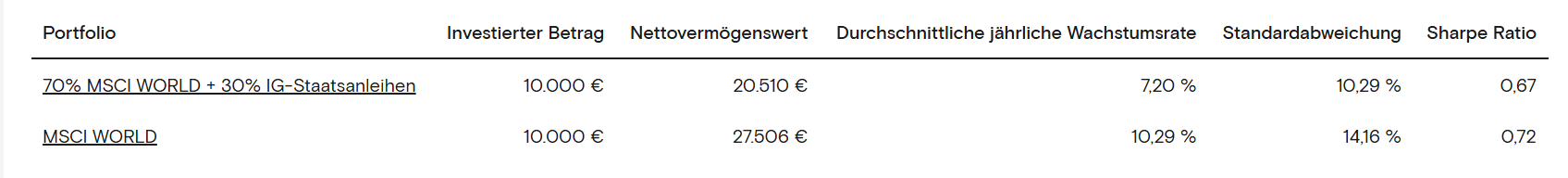 Neverdo gestern um 10:12 Uhr · bearbeitet gestern um 10:14 Uhr von Neverdo vor 17 Minuten von Schwachzocker: Es ist ein echter realer Verlust. Ganz in echt! Habe es ja wie einige hier selbst erlebt, aber 10 Jahre für 1,3 %....nein wirklich nicht, in der Zeit habe ich eine kleine Position füt zwei Jahre angelegt, das konnte man doch wirklich voraussehen. vor 58 Minuten von Puppi: Richtig. Ziel ist, ein besseres Rendite-Risiko-Verhältnis zu bekommen, z.B. in Form von ähnlicher Rendite, aber mit geringeren Drawdowns in Krisen. Grob gesagt soll sich so ein Multi-Asset-Bau in der Hinsicht (nach Kosten/steuerlichen Effekten!) mehr rentieren als eine einfache Mischung aus Aktien und Tagesgeld/Geldmarkt im entsprechenden Verhältnis (=die simpelste Form des von @stagflationoft angesprochenem "Risikoreich-Risikoarm-Modell"). Genau so ist das und ich rede von rd. 30 Jahren, in denen ich so etwas betreibe. Diesen Beitrag teilen Link zum Beitrag