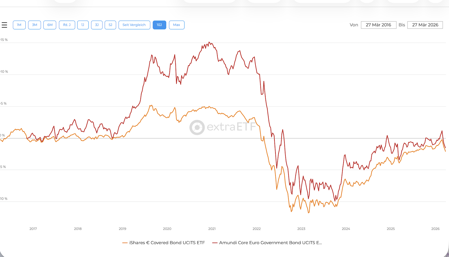 ramirez_asdf Samstag um 18:27 · bearbeitet Samstag um 18:35 von ramirez_asdf @Puppi: Danke für die Punkte, und gut dass du die an den Dezember Thread erinnerst Sorry, versehentlich hatte ich die ETF Positionen abgeschnitten im screenshot, neu hinzugefügt siehe unten. Ich kategorisiere für mich FG als RK1, da ich immer unter der 100T EUR Einlagensicherung bin. Meine Leiter ist auf 5 Jahre gestreckt. Die Liquidität und auch der Aufwand ist für mich ein Negativpunkt daher die Entscheidung auf ETF Bonds umzuschichten. vor einer Stunde von Puppi: Das hattest du im Dezember geschrieben in deinem Thread. Daher frage ich mich: Wenn du das willst, wieso hast du dann noch Unternehmensanleihen im Depot? Mein Verständnis ist: - Ich habe 2 Bond ETFs Staatsanleihen und Unternehmensanleihen, die nahezu 1:1 korrelieren, siehe zweites Bild - Wenn Bonds zu Aktien nicht korrelieren oder sogar invers korrelieren ist das ein großer Vorteil - Dadurch kann ich Abwärtsbewegungen mit Aufwärtsbewegungen in anderen Assets finanzieren und Rebalancing vollziehen - Dadurch erhöhe ich die langfristige Rendite Daher die ursprüngliche Frage, wie ihr die Korrelationen der Assets zwischen Aktien und Bonds seht? Oder ob ich einen Denkfehler habe. Diesen Beitrag teilen Link zum Beitrag