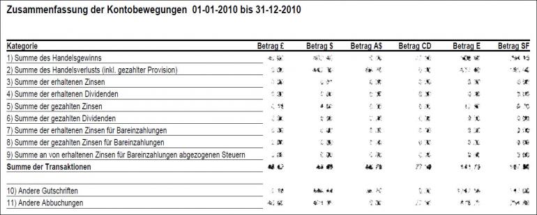 Thunder_Blade September 6, 2011 ...Hat einer von Euch bereits Erfahrung, wie die Gewinne / Verluste bei der Einkommensteuer erfasst werden... Hallo zusammen, ich beschäftige mich aktuell mit der Einkommenssteuer. Von meinem Broker IG-Markets habe ich eine detailierte Transaktionsliste für ganz 2010 erhalten. Da ich Devisen (EURUSD, CADCHF, USDJPY, ...) gehandelt habe, habe ich in den verschiedenen Währungen meine Gewinne und Verluste ausgewiesen. Wie gebe ich denn die verschiedenen Währungen im meiner Einkomenssteuererklärung an? Muss ich irgendwie umrechnen? ...Hat einer von Euch bereits Erfahrung, wie die Gewinne / Verluste bei der Einkommensteuer erfasst werden... Hallo zusammen, ich beschäftige mich aktuell mit der Einkommenssteuer. Von meinem Broker IG-Markets habe ich eine detailierte Transaktionsliste für ganz 2010 erhalten. Da ich Devisen (EURUSD, CADCHF, USDJPY, ...) gehandelt habe, habe ich in den verschiedenen Währungen meine Gewinne und Verluste ausgewiesen. Wie gebe ich denn die verschiedenen Währungen im meiner Einkomenssteuererklärung an? Muss ich irgendwie umrechnen? Im Anhang die Liste: Diesen Beitrag teilen Link zum Beitrag