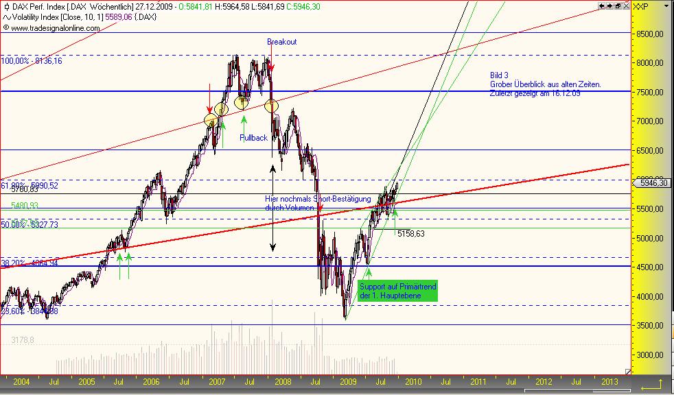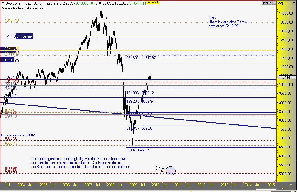 Denker Dezember 23, 2009 Guten Abend! Ich kopiere hier mal etwas rüber... die Bilder muss ich noch laden okay, wer Long ist der kann sich ja absichern und auf die Dinge warten die da kommen, aber 6400/500 direkt, dat glaub ik nit. Bei 6000 und später 6091 bis 6162 liegen dicke Steine. Was ich mit Sicherheit im langfristigen Kursverlauf erwarte, ist, dass der DAX die rote Abwärtstrendlinie testet. Das war schon mal die leichteste Option, die ich hier abgebe. Alles darüber hinaus wird schon sehr viel schwieriger zu beantworten sein. Leider vermindert sich das Kursziel der Abwärtstrendlinie von Monat zu Monat, hierdurch wird ein Test zum AZH für die nächste Zeit (auf Jahre) ein Wunschszenario bleiben. Die Fibo-Zeitprojektion ist eine Spielerei, dort könnte aber was sein? Ich lasse diese Fibos mal drin. Die Betrachtung auf das gesamte Chartbild würde imo für eine lange Seitwärtsphase sprechen, die am Hoch bei dem 2. Kursziel immer wieder abbrechen könnte. Am 2. Kursziel muss halt neu analysiert werden. Die Abwärtstrendlinie stammt übrigens aus Mitte Juni 2007. Was jetzt auch wieder mit Sicherheit gesagt werden kann ist die Tatsache, dass der DAX diese Abwärtstrendlinie nicht sofort überwinden wird. Ein komplettes Absacken der Kurse sehe ich aus heutiger Sicht nicht. Nur ein Breakout unter 5140 auf EoD würde ein Zielauf 3989 generieren. Die Chartdarstellung ist linear eingestellt. Der abgebildete Indikator zeigt einen langlaufenden MACD. Um die angezeigten Trendwenden vom MACD Signal (Kreuzung der beiden Linien) nicht so spät zu erhalten, nehme ich nicht den Linienbruch, sondern die Spitzen des MACD. Mittel-/ langfristige Analyse, also nichts für´s Daytrading hier: Kurszielermittlung aus Formationen und Projizierungen. Ich habe mich bemüht die Linien ziemlich exakt anzulegen. Eine Wahrscheinlichkeit die ich favorisiere, ist aus heutiger Sicht diese hier: Resistance zwischen ca. 6091 (1. projizierte Kursziel) bis 6162. Dort möglicher Rücklauf bis max. ca. 5140 bis 5032 oder aber Zwischenrrücklauf bis ca. 5572, 5480, 5350, wobei 5480 favorisiert. Unter 5140 max. 5111 würde die gesamte März Aufwärtshausse zunichte gemacht werden. Wahrscheinlicher wäre imo aber ein Halt bei ca. 3994. Das 1. Kursziel wird mit mehrmaligen Rückläufen einhergehen. Nach einer positiven Überwindung des 1. Kursziels wird dann das 62er RT (alt aus 2003) in den Vordergrund rücken. Hier erwarte ich eine sehr volatile Marktzeit bis der DAX auch dieses RT überwindet, wenn er es denn will.... Die Ausdehnung könnte hierbei bis zu dem 2. projizierten Kursziel laufen. Diese Marke wird er jedenfalls irgendwann testen. Dort erwarte ich keine Ausdehnung, vielmehr einen Rücklauf, der wieder Richtung 62er RT gehen wird und sich bis max. 4970 entwickeln könnte. Runter rennt es sich ja immer bekanntlich schneller also ein Hochlaufen. Das der DAX über dem 2. Kursziel weiter hochbrettern wird, dass sehe ich aus heutiger Sicht nicht. Imo, hier könnte eine stärkere Gegenbewegung stattfinden. Am 24.8.06 habe ich ein projiziertes Kursziel von ca. 6450 genannt. An dieser Marke wird der DAX weitere Brüche vollziehen. Bis zum 2. Kursziel wird noch einiges an Zeit vergehen. Im 5312er Bereich liegt ein Zwischenziel, ebenso an der Stopplinie bei 5860. Die grüne Aufwärtstrendlinie wäre wie alle anderen Linien auch als Widerstände bzw. Unterstützungen zu sehen. Noch etwas zum Schluss; ein drittes Kursziel kann erst projiziert werden, wenn der DAX runtergekommen ist. Hierzu müsste er die Unterstützung der projizierten Ebene testen. Diesen Beitrag teilen Link zum Beitrag