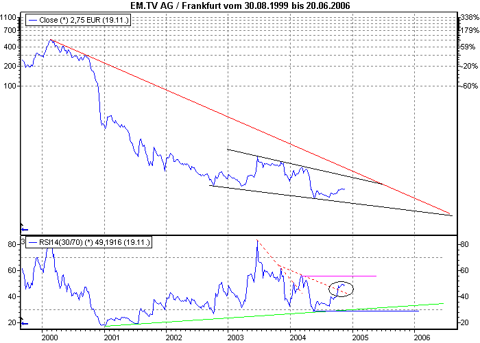 Aktiencrash November 22, 2004 Charttechnisch sieht es weiter be********* für die EM-TV Aktie aus. Ich denke das man erst einmal den Trendbruch des langfristigen Abwärtstrend (rot) abwarten muß. Der RSI kommt auf jeden Fall langsam aus seinem hohen Niveau runter. Die pos. Divergenz (grün) ist weiter voll intakt. Falls diese Bricht, dann muß die horz. Linie (blau) halten, ansonsten kommt noch einmal Abwärtspotenzial auf. Die neg. Konvergenzen (rot) gestrichelt schwächen sich in jeden Fall weiter ab, wie man sieht. Es wurde dieses Jahr bereits wieder eine nach oben gebrochen (schwarze Kreis). Potenzial sehe ich hier max. bis zur horiz. Linie (violett). positiver wäre, wenn der Indikator vorher dreht, dann könnte man die horiz. Linie (violett) tiefer setzten. Je tiefer diese Linie nach unten gesetzt werden kann, um so überverkaufter ist die Aktie, das schafft Energie zum durchstarten ! Ich denke die zwei Trendlinien (schwarz) geben den Bereich der Aktie vorläufig vor. Kann gut sein, das sich auf der unteren Linie ein Boden ausbildet im Jahr 2005. Fazit: Die Aktie denke ich, muß man noch nicht im Depot haben. Diesen Beitrag teilen Link zum Beitrag