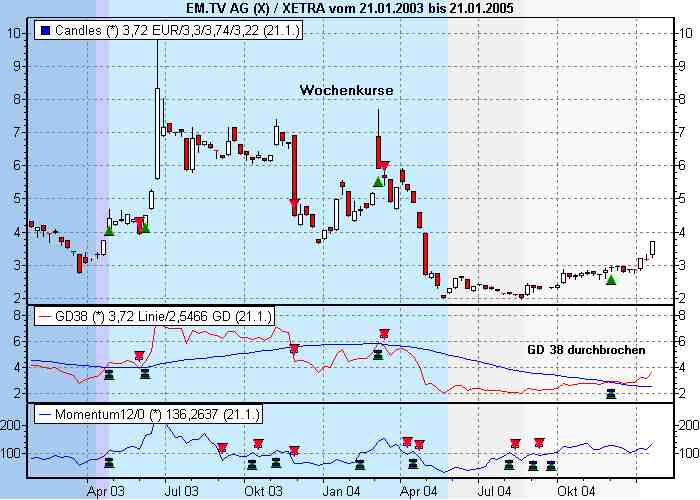 Denker Juni 4, 2005 Hier mal eine neue Analyse der EM.TV Inzwischen hat der Wert den primären Aufwärtstrend weiter gefestigt. Rein charttechnisch eine zur Zeit interessante Aktie. Von ihrem Höchststand im Jahr 2000 von 517,05 auf 1,99 im Mai 04 gefallen, einen Boden im Aug. 04 ausgebildet, befindet sich der Wert in einem intakten primären Aufwärtstrend. Die bearishe Dreiecksformation hat sie im Feb. 05 erfolgreich überwunden, sowie den langfristigen primären Abwärtstrend, siehe rote Linie. M. E. ist der Wert nach unten gut abgesichert, siehe grün, schwarz, rote Linie. Je nach Anlageverhalten könnte man einen SL unter die Marke von 4,51 setzen oder sie so lange halten, wie sie nicht mehr die primäre Abwärtstrendlinie verletzt. Persönlich wäre ich für die erste Variante. Nach oben dürfte sie die Marke von 6,15 anstreben, die Indikatoren RSi, MOM und MACD, CCi zeigen zur Zeit weiteres Kurspotenzial an. Konservative Anleger gehen erst bei 7,60 in den Wert. Nach der Dow Theorie wäre nach dieser Marke erst nachhaltig der primäre Abwärtstrend überwunden und die Aktie könnte dann weiter nördlich laufen. Hier der Chart Diesen Beitrag teilen Link zum Beitrag