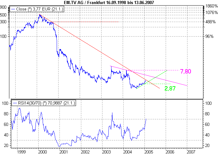 Aktiencrash Januar 23, 2005 Man sollte aber auch nicht versäumen, die Aktie auf langfristige Sicht zu analysieren ! Hier sind alle aktuellen Trendlinien (durchgehende Linie) mit horiz. Widerständen und Unterstützungen (gestrichelte Linie) eingezeichnet. Der wichtigste Widerstand liegt im Augenblick bei 7,80 . Dieser sollte erst einmal nachhaltig geknackt werden, damit es langfristig nach Norden geht. Betrachtet man sich den RSI auf Wochenbasis, dann kommt dieser jetzt schon in den überkauften Bereich an. Ich denke daher das bei 7,80 die Aktie ausgereizt sein wird. Man sollte sein SL immer schön nachziehen. Die letzte Unterstützung liegt bei 2,87 und deshalb würde ich das SL etwas tiefer setzten für´ erste (2,80 ), bis sich eine neue Unterstützung rausbildet. Fazit:: Kurzfristiger Aufwärtstrend intakt. Diesen Beitrag teilen Link zum Beitrag