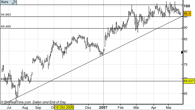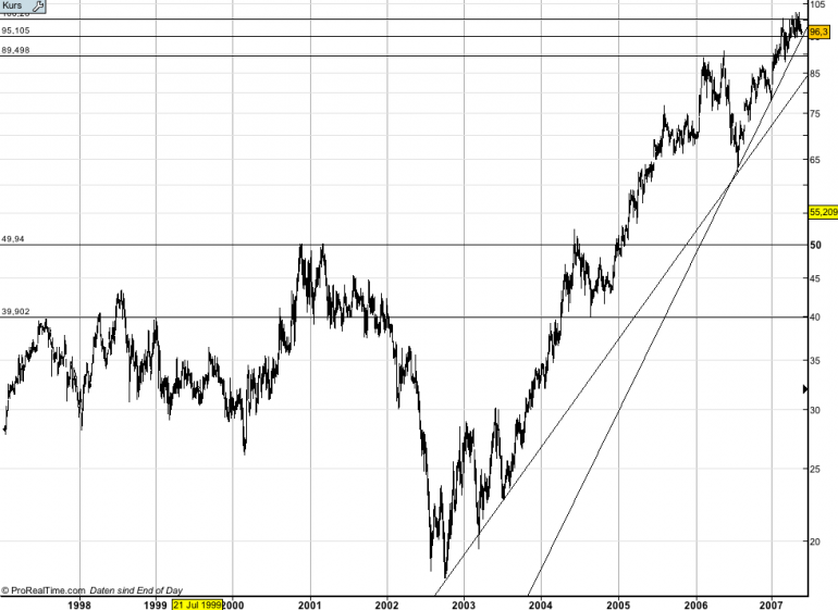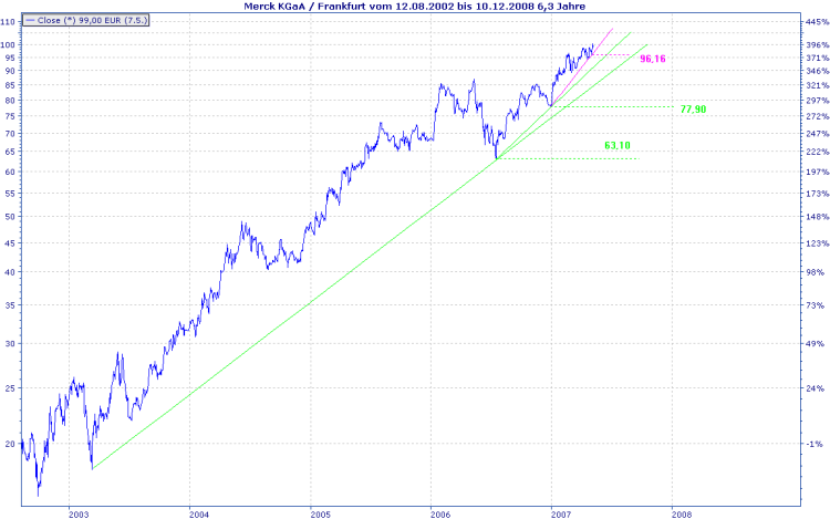Drella Mai 24, 2007 · bearbeitet Mai 24, 2007 von Profi So, ich bin zwar kein Charttechnicker aber ich versuche mich trotzdem mal ein wenig. Seit der Korrektur im Mai 2006 befindet sich Merck in einem beschleunigten Aufwärtstrend. Unterstützungen befinden sich bei: 69 89,5 95 Ein Widerstand befindet sich bei 101 Der Wert befindet sich seit März 2007 zwischen 95 und dem Widerstand bei 101 (hat das nen Namen wenn ne Aktie sich immer zwischen nem Widerstand und ner Unterstützung bewegt?). Wenn der Wert die 101 knackt, ist das ein Kaufsignal und ich werde das hier noch einmal posten. Wäre über Hinweise bezüglich der kleinen TA sehr erfreut und hier noch ein Langfrist Chart: Diesen Beitrag teilen Link zum Beitrag