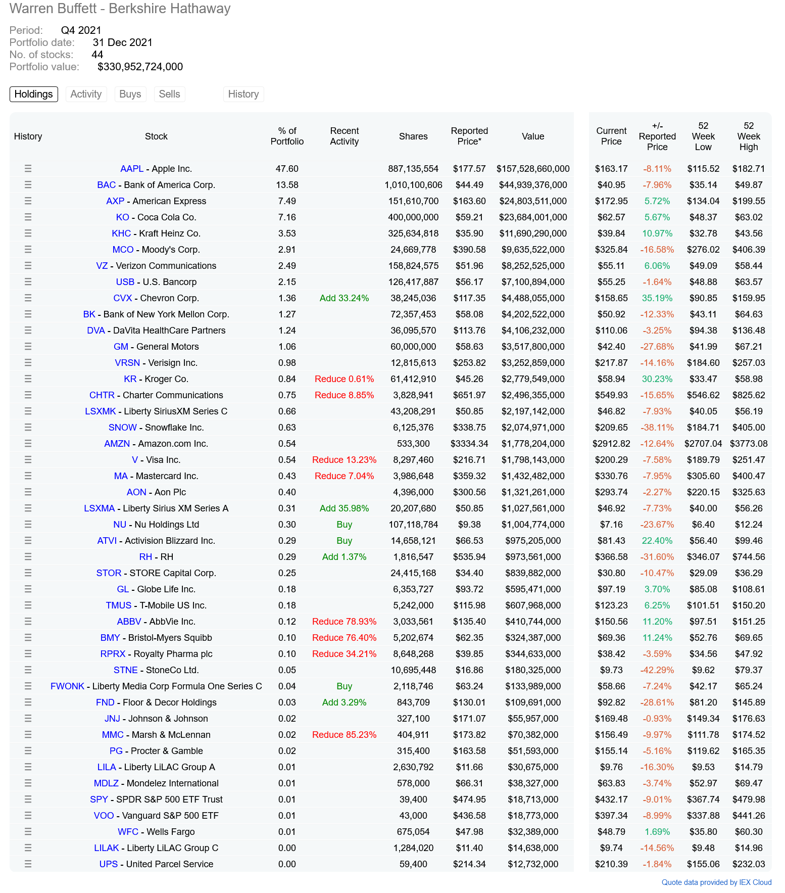 Ohne dies jetzt genau berechnet zu haben sehe ich aber auf den Ersten Blick eine diskrepanz zwischen der erzielten Rendite von Berkshire zu den gehaltenen Titeln. Also kurz gesagt ich glaube nicht dass die positive Jahresrendite von Berkshire von den gehaltenen Titeln kommt, auch die größte Position Apple weißt eine negative Rendite auf.