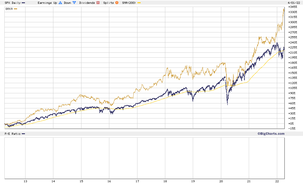 Toni April 2, 2022 · bearbeitet April 2, 2022 von Toni Dann ist Berkshire wohl doch nicht so schlecht.... Vergleich S&P-500-Index (schwarz) und Berkshire-Hathaway-Aktie (braun) über 10 Jahre: +330% ggü. +217% lese ich da ab.... Berkshire läuft immer dann besser, wenn die Börsen im allgemeinen eher schlecht laufen....das war schon immer so. https://seekingalpha.com/article/4499372-berkshire-hathaway-all-time-high-still-buy Diesen Beitrag teilen Link zum Beitrag