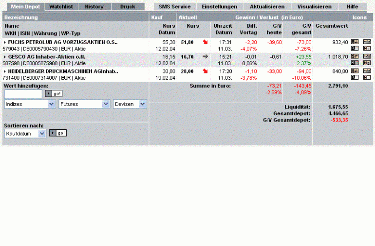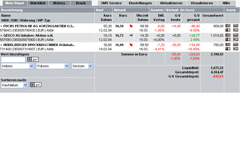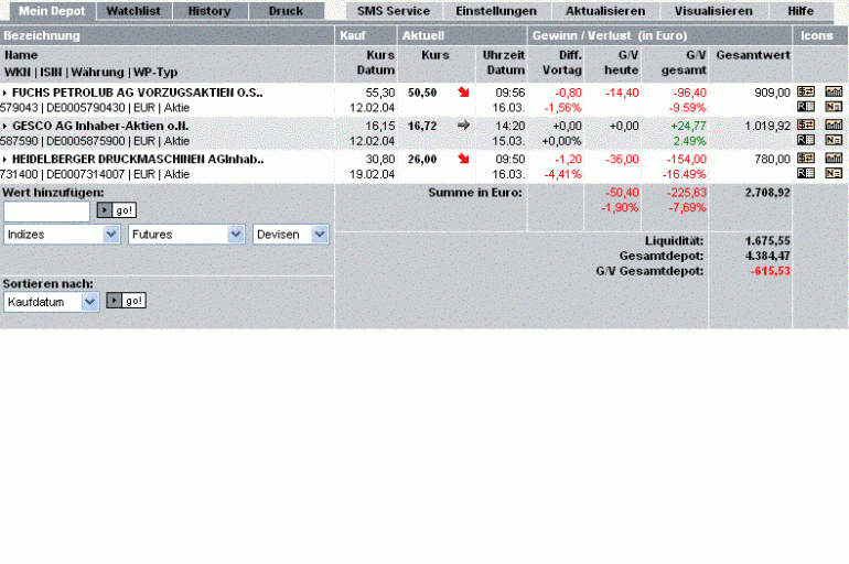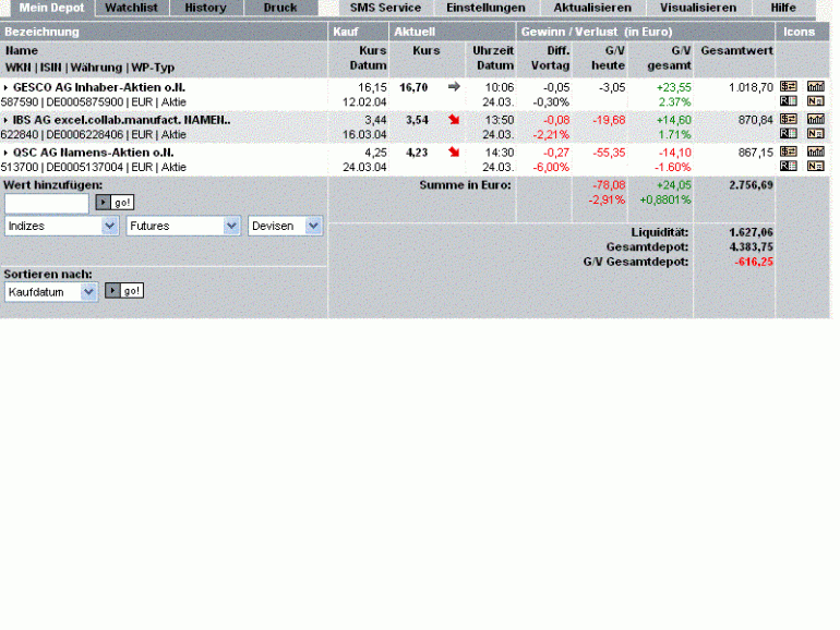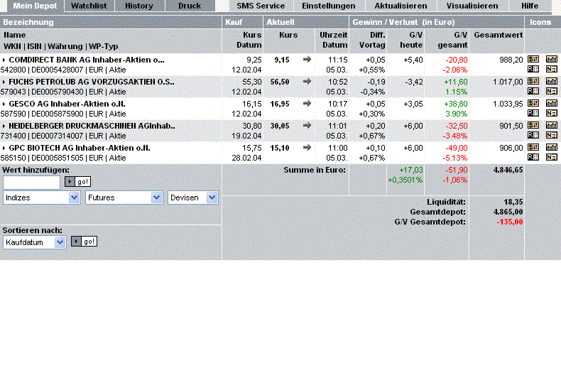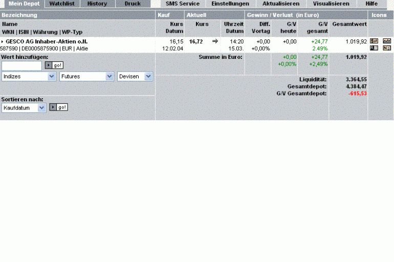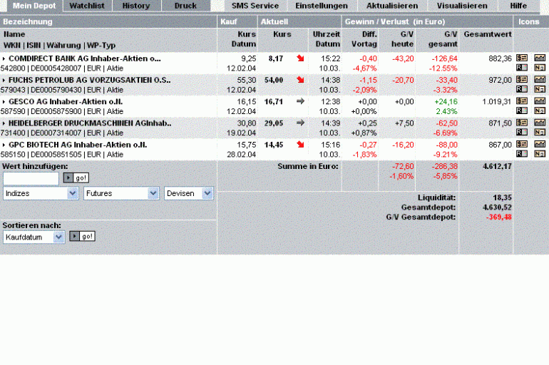 tron21 März 5, 2004 hallo zusammen, anbei habe ich ein bild vom depot...........ist zwar noch im minus aber es erholt sich langsam....... eigentlich hätte ich comdirect verkaufen müssen......habe aber gehoft das der titel sich wieer erholt........in letzter zeit ging es auch wieder leicht nach oben...... habe keine mittel mehr um weitere titel zukaufen.....soweit habe ich nichts schlechtes über einen dieser titel gehört was ein verkaufen auslösen könnte! B) Diesen Beitrag teilen Link zum Beitrag
