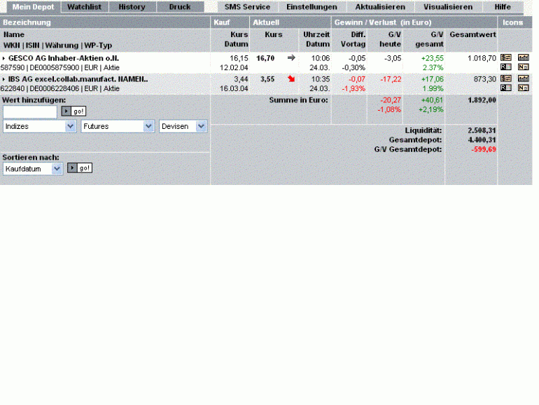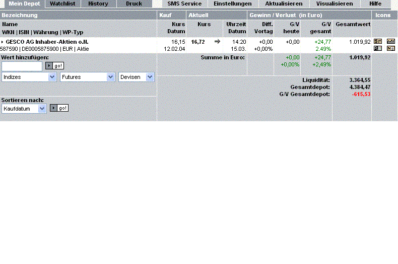 tron21 März 24, 2004 so ich habe es leider nicht früher geschafft mich wieder ums depot zu kümmern. wie ihr unten seht sind jetzt nur noch zwei titel im depot; gesco und ibs. gesco war der einzige titel der nicht unter den stoppkurs gefallen ist. ibs habe ich nach diskussion im bereich "einzelwerte" ( https://www.wertpapier-forum.de/index.php?showtopic=182 ) gekauft. bis jetzt ist der titel auch nicht ins minus gerutscht. was die sache mit den stoppkursen angeht werde ich eine änderung vornehmen: unter "depotstart" ( https://www.wertpapier-forum.de/index.php?showtopic=621 ) könnt ihr lesen das der jeweilige stoppkurs immer am freitag aktualisiert werden soll. ich habe festgestellt das dieser zeitraum eventuell etwas sehr kurz gewählt ist! also werde ich die stoppkurse nur einmal im monat aktualisieren!!! ich hoffe das dieser schritt mehr sinn macht! hier die aktellen stoppkurse: gesco : 15,35 ibs : 3,10 das einzige was mich im moment stört ist die tatsache das ich noch einen zu hohen barbestabd habe.......ich bin aber guter hoffnung das ich hier bald einen wert finden werde von dem ich mir gewinne verspreche!!!! solltet ihr noch tipps für mich haben dann immer her damit.....sehr viele posten ja leider nicht bei mir....... :'( Diesen Beitrag teilen Link zum Beitrag