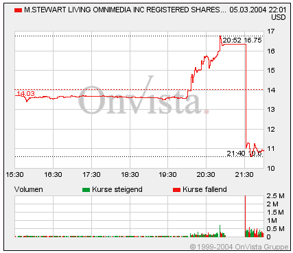 Teletrabbi März 7, 2004 Hier mal ein spektakulärer Intradaychart: Zuerst spekulierten die Anleger auf einen Freispruch der Firmenchefin. Dann kam das Urteil: schuldig in allen Punkten. Der Handel wurde ausgesetzt. Bei Wiederaufnahme am selben Tag ein deftiges Minus. Diesen Beitrag teilen Link zum Beitrag