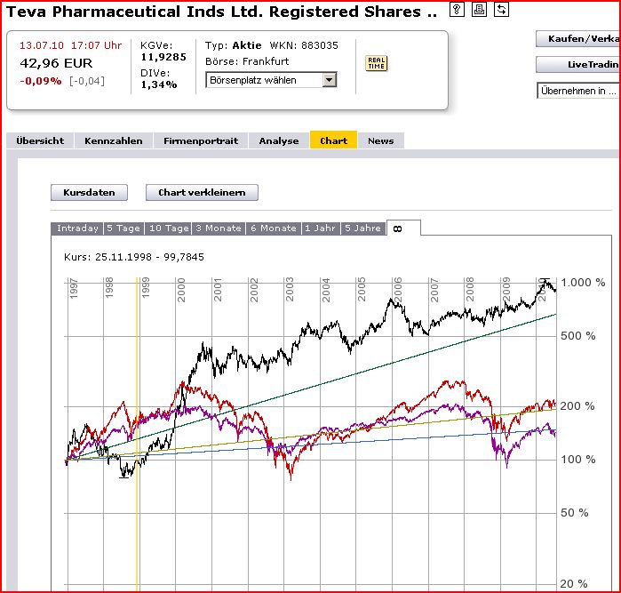 Rein historisch gesehen hatte Teva immer wieder mal solche Phasen - relativ unabhängig vom Aktienmarkt. Langfristig Performance war beeindruckend. Was rein gar nichts für die Zukunft heissen mag. Momentan dürfte Teva aber stark unterbewertet sein meines Erachtens. Es kann kurzfristig sicher noch weiter nach unten gehen aber längerfristig gesehen sehr gute Margin of Safety m.E.