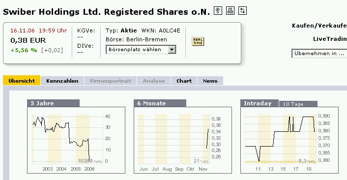 |Zero November 16, 2006 · bearbeitet November 16, 2006 von |Zero nuja so würde ich das nun net sehen. ich bin kein freund von einfach mal auf den chart schauen und dann sagen ok, is nix. fact ist: - der wert wird seit 9.11 in berlin gehandelt - ipo in singapur 17-fach überzeichnet - noch keine analysten bewertung, weil dies gegen das recht in singapor verstößt, darf erst ne zeit nach der ipo erfolgen - 10mio handelsvolumen in deutschland - lt. orderbuch net nur kleine zockeranleger dabei wahrscheinlich hast du nur den preis gesehn, gedacht oh penny stock das is aber net gut und mal ne wkn irgendwo eingetippt. ich will dich in keinster weise persönlich angreifen, nur ich halte es für schwach in nem forum gleich zu sagen "wasen unsinn, ne aktie die bei 0,33 notiert" btw mittlerweile bei 0,38 hier noch was Swiber, a niche service provider to the offshore oil and gas industry, boosts order book with contracts worth USD9.36 m; signs USD5.75 m LOI in India Latest LOI reaffirms commitment to grow Indian market SINGAPORE - 16 November 2006 - Newly-listed Swiber Holdings Limited (\'Swiber\' or together with its subsidiaries, the \'Group\'), an integrated offshore Engineering, Procurement, Construction, Installation and Commission (\'EPCIC\') contractor with a complementary business in the supply of marine support vessels, today announced that it has successfully secured formal contracts for the Letters of Intent worth approximately USD9.36 million detailed in its listing Prospectus dated 27 October 2006. The latest contracts provided a boost to order book to approximately USD16.5 million as at 13 November 2006. At the same time, reflecting continued growth momentum, the Group also announced that its wholly-owned subsidiary, Swiber Offshore Pte. Ltd., has signed a Letter of Intent (\'LOI\') worth approximately USD5.75 million with BG Exploration and Production India Limited (\'BG Exploration\'). The LOI entails Swiber to provide a spread of vessels for the transportation of jackets and decks for BG Exploration within Indian waters and the project is expected to be executed in the first half of 2007. BG Exploration is a subsidiary of BG India. The latter has been active in India for more than 10 years and is one of the largest foreign investors in India\'s oil and gas sector. BG India, through BG Exploration, holds 30 per cent interests in the Tapti gas field and the Panna/Mukta oil and gas fields, offshore Mumbai, which produce over ten per cent of India\'s domestic oil and gas production. India represents one of the most dynamic and fastest growing market for offshore oil and gas activities given its significant amounts of oil and natural gas resources. The latest LOI reaffirms Swiber\'s commitment to the India. \'We are wasting no time in pushing ahead with our plans to grow the Indian market which was identified as part of our expansion plans during our recent IPO in early November. India is a key market for Swiber, given the oil and natural gas resources in the country. With the fast-paced growth of the offshore oil and gas sector in India, we expect to see greater revenue contribution from this market going forward,\' said Swiber\'s founder and Managing Director, Mr Raymond Goh . \'To effectively reach out to our customers in India, our intention is to establish an office there by FY2007. We may also consider entering into strategic alliances for co-operation with parties such as engineering firms and offshore EPCIC contractors with the relevant experience in the offshore oil and gas industry in India,\' added Mr Goh. USD9.36 million contracts At the same time, Swiber, through its wholly-owned subsidiary, Swiber Marine (Malaysia) Sdn Bhd, secured a supplementary agreement with a Malaysian Main Contractor for oil major. The contracts, totaling approximately USD9.36 million, are for the provision of offshore transportation and installation works of Topside and a Floating, Storage and Offloading (FSO) system for an oil field development project in the East coast of Peninsula Malaysia. These two projects are expected to be executed in 2006. Said Mr Goh, \'We are delighted to secure offshore EPCIC business from this Malaysian main contractor who is an existing client of Swiber. As a stamp of quality, nothing speaks more strongly than winning projects from a repeat customer. We believe that it strongly attests to the caliber of the people in Swiber and the quality of service we consistently provide to our customers.\' None of the directors or controlling or substantial shareholders of the Company has any interest, direct or indirect, in the above transactions other than through their shareholdings in the Company. The Singapore-based Group, which was listed on the Main Board of the Singapore Exchange on 8 November 2006, recently announced sterling financial results for third quarter and nine months ended 30 September 2006, including record revenue and earnings. Swiber achieved a 310.3% surge in net profit to a record USD5.6 million for three months ended 30 September 2006, compared with USD1.4 million in the corresponding quarter last year. Revenue rose 748.4% to a record USD29.2 million, from USD3.4 million previously, driven by significant increase in the level of activities for its offshore EPCIC business. Adding on three successive quarters of strong growth, Swiber achieved record revenue of USD43.2 million for nine months ended 30 September 2006, a 250.3% year-on-year increase over USD12.3 million previously, while net profit reached a record USD8.2 million, up 124.8% from USD3.6 million. The year-to-date net profit has already surpassed the earnings Swiber achieved for the entire financial year 2005 of USD6.2 million. Corporate Profile Established in 1996, Swiber is a niche service provider to the offshore oil and gas industry, with a complementary business in the supply of marine support vessels. The Group offers a full suite of offshore EPCIC services which can be customised in accord