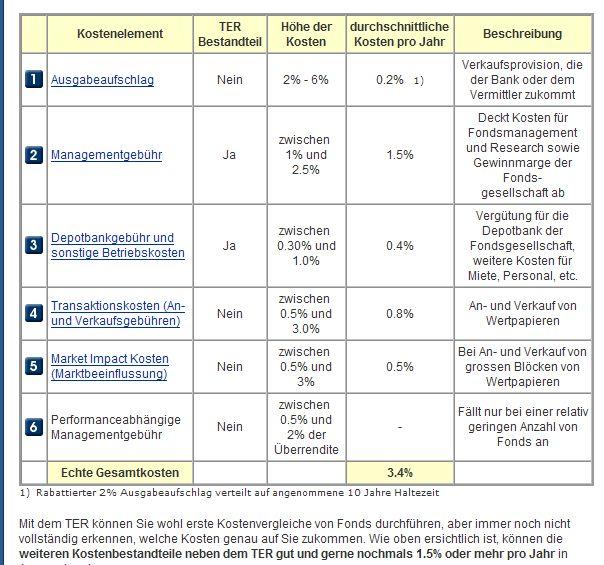 Monetenfuchs November 19, 2006 · bearbeitet November 19, 2006 von Monetenfuchs viele Fragen zum Thema Fonds und Fondssparpläne treten immer wieder auf. Dieser Thread soll Anfängern die Grundinformationen übersichtlich vermitteln. Kosten von Fonds Vermögensaufbau mit Fonds gibt's nicht zum Null-Tarif, an vielen Stellen entstehen Kosten, die die Rendite eines Fonds negativ beeinflussen. Direkte Kosten Depotgebühr: Ein Depot für Kunden zu führen, Abrechnungen zu verschicken, etc. kostet eine Bank einiges. Manche belasten diese Aufwände an die Kunden weiter, manche bieten kostenlose Depots, holen sich die Kosten aber an anderer Stelle wieder herein. Transaktionskosten: Der Kauf und Verkauf von Fondsanteilen kostet auch. Zu unterscheiden ist, wo man Fonds handelt:Beim Kauf mit der Fondsgesellschaft zahlt man einen Ausgabeaufschlag, sofern dies ein Vermittler nicht rabattiert. Der Verkauf ist i.d.R. kostenfrei. Beim Kauf und Verkauf über die Börse fallen die üblichen Transaktionskosten für Börsengeschäfte der Bank und der Börse an. Ein Ausgabeaufschlag existiert hier nicht, stattdessen kann es einen Spread geben, einen Unterschied zwischen Kauf- und Verkaufspreis, der jedoch deutlich niedriger als beim Handel mit der Fondsgesellschaft ist. außerbörslich: hier fallen die Börsengebühren fort, bei manchen Banken entfallen auch die bankspezifischen Gebühren ganz oder sind zumindest billiger (comdirect LiveTrading, Deutsche Bank PIP, etc.) Diese Kostenfaktoren kann man selbst durch geeignete Wahl seiner Depotbank beeinflussen. Indirekte Kosten Dies sind all die Kosten, die innerhalb eines Fonds anfallen und dem Fondsvermögen entzogen werden. Auf diese Faktoren hat man als Anleger keinen direkten Einfluß zu nehmen, außer den, bestimmte Fonds zu kaufen oder zu meiden. Verwaltungskosten: Hierzu zählen u.a. Verwaltungstätigkeit der Fondsgesellschaft (Management Fees), Aufwandsersatz für Informationstätigkeit, Rechtsberatung, Wirtschaftsprüfung, Depotbank-, Lagerstellenvergütung, Steuern, ...Wichtige Kennzahl ist hierfür ist die Gesamtkostenquote (Total Expense Ratio, kurz: TER).Aktienfonds: 1,0 ... 2,5% Rentenfonds: ~ 0,8% Geldmarktfonds: ~ 0,5% ETFs: 0,15 ... 0,9% Mehr: hier [*]Transaktionskosten: Wenn der Fondsmanger z.B. Aktien umschichtet, kostet auch ihn dies eine Gebühr. [*]Erfolgsvergütung: Bei einigen Fonds erhalten die Fondsmanager eine zusätzliche, erfolgsabhängige Vergütung (Performance fee). Vielfach unbemerkt sind die Verwaltungskosten durch einen Faktor in der Vergangenheit gestiegen: die Kickbacks. Dies sind Bestandsprovisionen der Fondsgesellschaft an die Vermittler für die zugeflossenen Kundengelder. Detailliert sind Kickbacks in diesem Artikel beschrieben. Diesen Beitrag teilen Link zum Beitrag