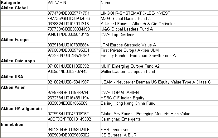 et3rn1ty Februar 20, 2007 · bearbeitet April 14, 2009 von Chris1975_ Ihr habt abgestimmt - hier ist das Ergebnis. Hier das Ergebnis zum leichteren Kopieren: Aktienfonds Global ISIN - KAG - Fondsname DE0009774794 - Landesbank Berlin Invest - Lingohr Systematic LBB Invset LU0114760746 - Franklin Templeton Investment Funds - Templeton Growth Euro LU0044747169 - State Street Global Advisors - Global Advantage Funds Major Markets Aktienfonds Europa ISIN - KAG - Fondsname DE0009795831 - First Private Investment Management - First Private Europa Aktien ULM LU0107398884 - JPMorgan Asset Management - JPM Europe Strategic Value A LU0048578792 - Fidelity Funds SICAV - Fidelity European Growth Fund Aktienfonds Aisen/Pazifik ISIN - KAG - Fondsname IE0004866889 - Baring Fund Managers - Baring Hong Kong China Fund DE0009769760 - DWS Investment GmbH - DWS Top 50 Asien DK0016259187 - ISI - ISI Far East Equities Aktienfonds Emerging Markets ISIN - KAG - Fondsname LU0011850392 - Black Rock Gmbh - MLIIF Emerging Europe Fund A FR0000292278 - Comgest - Magellan LU0047906267 - State Street Global Advisors - Global Advantage Funds Emerging Markets Rentenfonds ISIN - KAG - Fondsname LU0029871042 - Franklin Templeton Investment Funds - Templeton Global Bond Fund Class A LU0085494788 - ABN Amro Asset Management - Global Emerging Markets Bond Fund AT0000859509 - Raiffeisen Kapitalanlagegesellschaft mbH - Raiffeisen Europlus Rent A Geldmarktfonds ISIN - KAG - Fondsname DE0009752477 - Pioneer Investments - Pioneer Investments Euro Geldmarkt Plus DE0008474255 - DWS Investment GmbH - DWS Geldmarktfonds DE0009769158 - SEB Invest GmbH - SEB Moneymarket Immobilienfonds ISIN - KAG - Fondsname DE0009802306 - SEB Immobilien Invest GmbH - SEB Immoinvest DE0006791809 - KanAm Grund Kapitalanlagegesellschaft mbH - KanAm Grundinvest Fonds DE0009846451 - AXA Investment Managers - AXA Immoselect Branchen-/Themenfonds ISIN - KAG - Fondsname LU0172157280 - Black Rock Gmbh - MLIIF World Mining Fund LU0271656133 - Pioneer Asset Management - Pioneer Global Ecology LU0121747215 - Sarasin Multi Label SICAV - Sarasin New Energy Fund Immobilienaktienfonds ISIN - KAG - Fondsname LU0088927925 - Henderson Global Investors Ltd. - Henderson Horizon Pan European Property LU0188853955 - DJE Investment - DJE Real Estate LU0237697510 - Fidelity Funds SICAV - Fidelity Global Property Fund Grüße, et3rn1ty. Eine Übersicht über die Performance der Empfehlungen seit der Abstimmung durch die User findet Ihr hier: https://www.wertpapier-forum.de/index.php?showforum=62 Diesen Beitrag teilen Link zum Beitrag