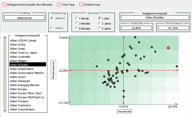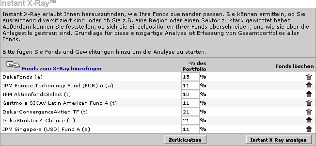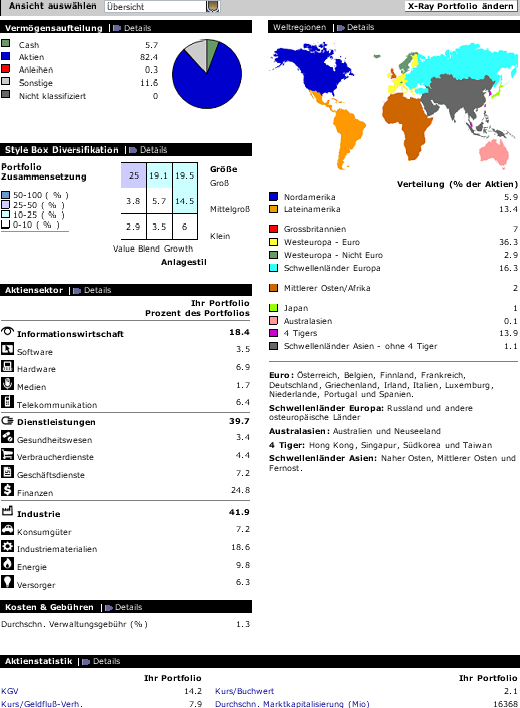 Jose Mourinho Juli 27, 2007 · bearbeitet August 1, 2007 von Chris1975_bayern Morningstar X-Ray: Instant X-Ray erlaubt Euch herauszufinden, wie Ihre Fonds zueinander passen. Ihr könnt ermitteln, ob Ihr ausreichend diversifiziert sind, oder ob Ihr z.B. eine Region oder einen Sektor zu stark gewichtet habt. Außerdem könnt Ihr feststellen, ob sich die EinzelpositionenEurer Fonds überschneiden, und wie sie über die Anlagestile gestreut sind. Grundlage für diese einzigartige Analyse ist Erfassung von Gesamtportfolios aller Fonds. Im ersten Schritt gebt Ihr die Fonds und Eure Gewichtung ein. In der Auswertung erhaltet Ihr Eure Ländergewichtung, die Morningstar-Style Zuordnung (Value/Growth etc.), die Aktiensektoren usw. http://www.morningstar.de/instantxray/inde...&country=de Onvista Fonds-Map Hier könnt Ihr Länderspezifische und in der 2. Ebene auch Fondsbezogene Volatilität und Chance messen. http://fonds.onvista.de/fondsmap/index.html Diesen Beitrag teilen Link zum Beitrag