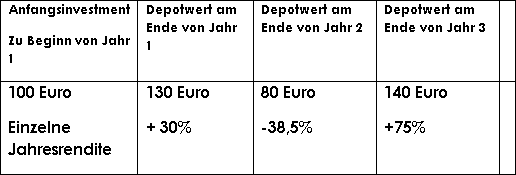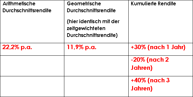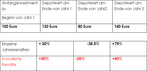 PSTVA Juli 23, 2007 · bearbeitet August 1, 2007 von Chris1975_bayern Die Langfristige Wertentwicklung eines Fondsinvestments nach Anlagekosten. Die Beispielrechnung zeigt eindrucksvoll, welche krassen Unterschiede in der Wertentwicklung selbst bei einem kleinem Portfolios sich im langfristigen Zeitablauf ergeben, wenn die Kosten der Anlage nicht optimiert werden. Der allgemeine TER liegt aber weit über dem Beispiel. Quelle: Gerd Kommer Renditeberechnungsmethoden Hier möchte ich mal aufzeigen mit welcher Renditekosmetik die Marketing-Experten der Fondsgesellschaften ihre Produkte in den Markt drücken wollen und die Augen für diejenigen öffnen die nur nach Sterne und Performance Ihre Fonds aussuchen vom nicht passenden Benchmark und passenden Zeiträumen ganz zu schweigen. Die Frage ist nun: Wie hoch war die Rendite von dem 3 Jahres Investment? Antwort: Das kommt ganz darauf an- je nachdem, wie wir sie berechnen. Arithmetischen Durchschnittsrendite: Die Jahresrendite entspricht dem Wertzuwachs des Depots im Jahresverlauf dividiert durch den Depotwert am Anfang des Jahres. Für das Jahr 2 ist das beispielsweise ein Wertverlust von 50 Euro dividiert durch 130 Euro (Depotwert zu Beginn von Jahr 2 ) Woraus sich eine Rendite von -38,5% ergibt. Die arithmetische Durchschnittsrendite für den Dreijahreszeitraum ist nun ganz einfach der Durchschnitt aus den drei einzelnen Jahresrenditen, also: 30%+(-38,5%)+75%=-66,5% : 3= 22,2% p.a. Eine stattliche Zahl. Doch das Ergebnis kann auch ganz anders aussehen. Geometrische Durchschnittsrendite: Für diese Berechnung verwendet man folgende Formel: Anfangsinvestment x ( 1+r)n= Endwert des Investments Dabei ist r die Rendite als Dezimalzahl (also der Wert, den wir ausrechnen wollen) n ist die Anzahl der Jahre. Für das Investment würde die Formel wie folgt aussehen: 100 x(1+r)3=140 Wenn wir diese Formel nach r auflösen, erhalten wir: r=(140:100)1/3 – 1= 11,9% p.a. Wir sehen die Rendite ist um fast Hälfte geschrumpft. Die geometrische Durchschnittsrendite ist der gleichbleibende Jahreszinssatz , der unter Berücksichtigung des Zinseszinseffekts von der Anfangsinvestition zum Endwert der Investition führt. Dabei wird unterstellt , dass während dieses Zeitraums dem Depot weder Mittel zugeflossen noch Gelder aus ihm abgeflossen sind. Die geometrische Rendite stimmt nur dann mit der arithmetischen Durchschnittsrendite überein, wenn die jährlichen Ist-Renditen nicht schwanken. Bei schwankenden Jahresrenditen-wie in diesem Beispiel und wie auch zumeist in der Realität- ist die geometrische Durchschnittsrendite stets niedriger als die arithmetische. Je stärker die Schwankungen der Jahresrendite, desto größer auch der Unterschied zwischen arithmetischer und geometrischer Rendite. Kumulierte Rendite: Die kumulierte Rendite ist im Gegensatz zu den vorangegangenen keine Durchschnittsrendite, sondern eine >angesammelte< Rendite (kumulieren heißt so viel wie ansammeln) . Für das Investment sähe die kumulierte Rendite von Jahr zu Jahr folgendermaßen aus: Die einzelnen Renditewerte kommen wie folgt zustande: Jahr 1: 30 Euro Zuwachs gegenüber dem Anfangsinvestment von 100 Euro; Jahr 2: 20 Euro Gesamtverlust gegenüberdem Anfangsinvestment von 100 Euro; Jahr 3 : 40 Euro Zuwachs gegenüber dem Anfangsinvestment von 100 Euro. Die kumulierte Rendite ist – obwohl in Werbeanzeigen oft verwendet – im Grunde genommen völlig nutzlos, da niemand ein Gefühl dafür besitzt, was zum Beispiel der aus der Fondswerbeanzeige entnommene Renditewert von +396% für Fonds X, die Aktie Y oder das Musterdepot Z im Zeitraum von 1995 bis 2000 wirklich bedeutet. Die verschiedenen Renditeberechnungsmethoden erlauben Anlageberatern, eine gegebene Rendite in rechnerisch korrekter, aber oft täuschender Absicht so zu manipulieren, dass die tatsächliche Performance im jeweils vorteilhaftesten Licht erscheint. Diesen Beitrag teilen Link zum Beitrag