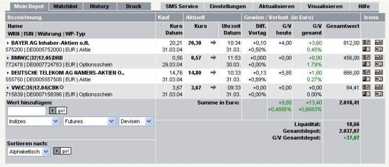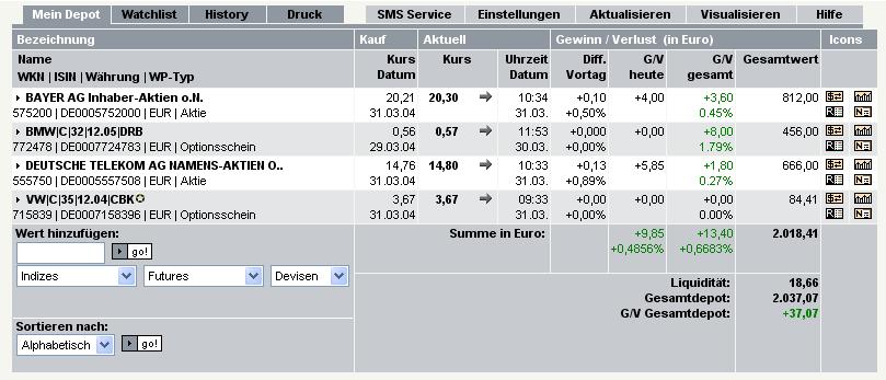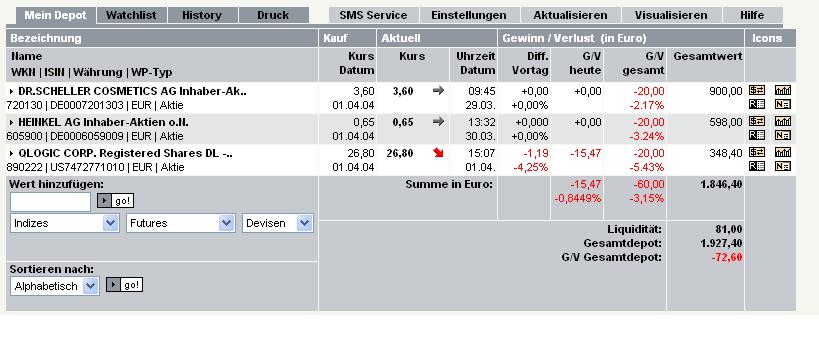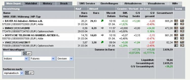 Scarface März 31, 2004 · bearbeitet März 31, 2004 von Scarface Hallo Wollte hier auch mal mein Musterdepot vorstellen. Werde es 1x pro Woche Aktualisieren. Es ist keine besondere Strategie vorhanden. jedoch achte ich auf die Flops & Tops des DAX. Hier nun mein aktuelles Musterdepot Angefangen mit 2000. Bis jetzt ohne Ordergebühren. Will es aber noch ändern Diesen Beitrag teilen Link zum Beitrag