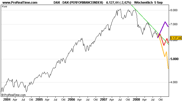 stocksurfer September 6, 2008 · bearbeitet September 6, 2008 von stocksurfer Meine persönliche Jahresendprognose ist weiterhin 4500 im DAX! oho, das wäre aber drastisch. Ich habe deine Variante mal orange eingezeichnet. Mir scheint die rote Variante "natürlicher". Ergäbe ca. 5.800 Aber auch wenn man den (grünen) Abwärtstrend fortschreibt, landet man bei ca. 5.500 Die bullische Variante wäre aber auch nicht schlecht Man wird sehen.. :santa: Diesen Beitrag teilen Link zum Beitrag