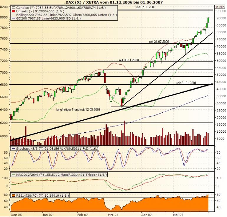 Faceman Juni 3, 2007 Mal von mir auch wieder ein kleines Analyschen: Der DAX nimmt kräftig Kurs auf das Allzeithoch aus dem Jahr 2000. Zuvor hat er auch die letzten Hürden, die 7500, und die 7800 hinter sich gelassen. Allerdingsmacht mir persönlich die steigende Dynamik und die in den letzten Tagen steigenden Umsätze ein bischen Sorgen. So liegt der RSI schon über 80, auch die Schere beim MACD öffnet sich weiter. Auch das Momentum (aktuell nicht angezeigt) liegt mit über 106 schon ziemlich hoch. Wie nun weiter? Zunächst sollte - vielleicht schon nachste Woche - das Allzeithoch angetestet werden. Dies würde zumindest der Dynamik der letzten 2 Tage entsprechen. Dass das Allzeithoch im ersten Anlauf genommen wird, ist allerdings nicht zu erwarten. Vielmehr sollte man sich jetzt jederzeit auf eine Konsolidierung einstellen. Diese dürfte allerdings schnell bei spätestens 7650 Punkten verpuffen. Mittelfristig erwarte ich jedoch eine Korrektur, die auch gesund wäre und dem Markt sicher guttun würde. Das Korrekturpotential ist hierbei auf 6400-6450 Punkte beschränkt, was derzeit knapp 20% ausmacht. Diesen Beitrag teilen Link zum Beitrag