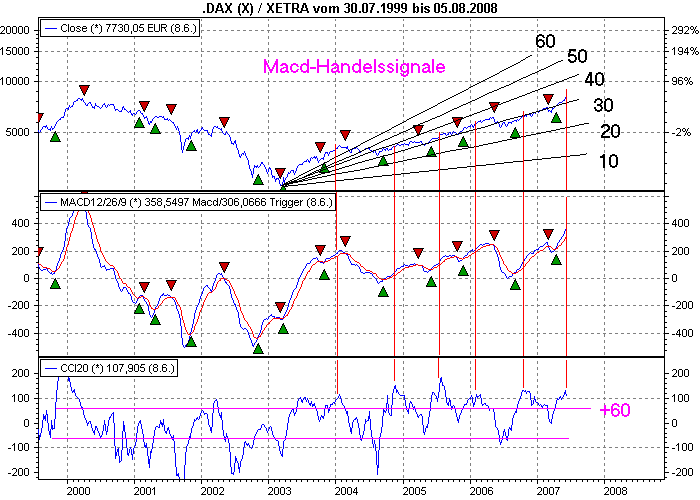 Aktiencrash Juni 7, 2007 Aus reiner Indikatorensicht ist bisher nichts außergewöhliches passiert. Der CCI hat den Bereich +100 wieder einmal überschritten und beginnt wie bisher wieder zu fallen. Begleitet wurde dieses fallen des CCI allerdings durch einen weiterhin steigenden Dax. Erst bei erreichen der +60iger Linie im CCI ist die Aufwärtsdynamik so abgeflaut, das der Dax in einen Seitwärtstrend überging bzw. kurzfristig konsolidierte. Der Macd hat sein Verkaufsignal ebenfalls erst einige Wochen nach dem CCI-Top generiert (CCI-Top = senkrechte Linie rot). Fazit: Bis zum erreichen der +60iger Linie im CCI sollte man jeder Zeit mit einem weiter steigen Dax rechnen, bevor es wirklich zu größeren Rückschlägen bzw. zum Seitwärtstrend kommt. Diesen Beitrag teilen Link zum Beitrag