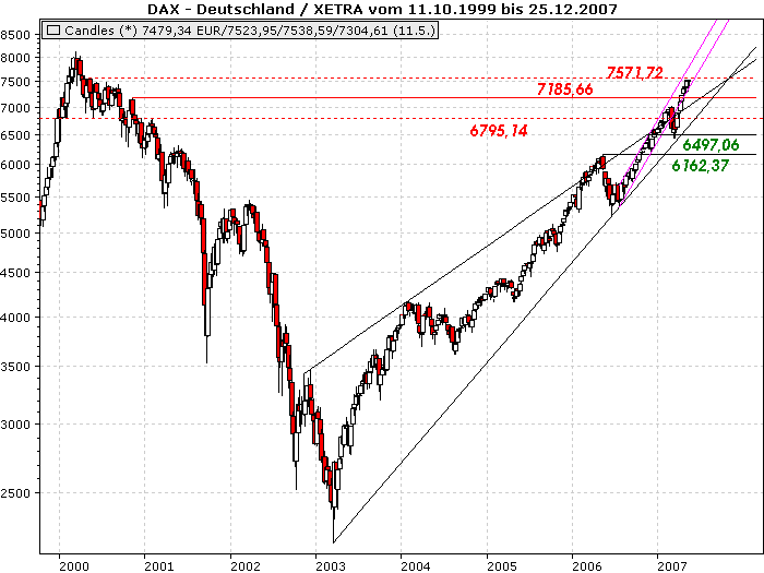 et3rn1ty Mai 18, 2007 Nächster Widerstand resultiert aus dem Wochenhoch im Mai 2000 bei rund 7571 Punkten. An dieser Marke dürfte die Entscheidung anstehen - Allzeit-Hoch noch in diesem Jahr oder weitere Konsolidierung zurück bis an die 7.100 Punkte-Marke. Wir stehen kurz vor dem Widerstand. Ich bin wirklich gespannt wie der Kampf ausgeht. Grüße, et3rn1ty. Diesen Beitrag teilen Link zum Beitrag