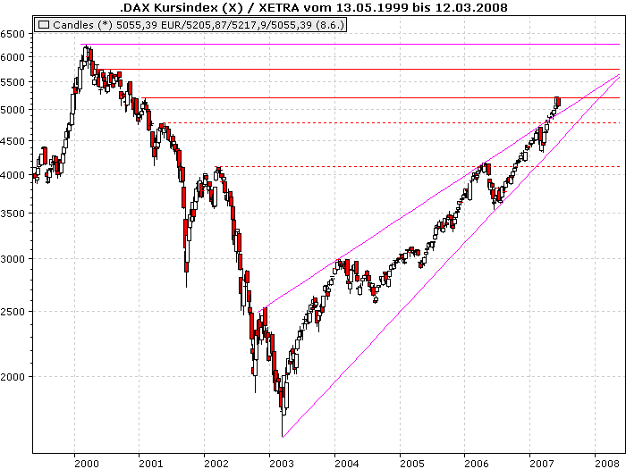 Onassis Juni 8, 2007 Moin, Moin - Warum hast du langfristig nicht die Pullbacklinie über die absoluten Hochs mit drinne? Bekräftigt deinen Kreuzwiderstand bei 7400 ungemein. Ich bin ein bißchen aus der Übung, reza. Mache ja fast nur noch daytrading und versuche Joe Ross nach zu eifern. Aber trotzdem hier mal ein Chart mit alten Höchstständen, welche ebenfalls als Unterstützungen dienen werden. Da muss sich der DAX erstmal nach unten durchboxen. Außerdem ist es heute ziemlich volatil. IMO eine gute Sache, dann jetzt tauchen die ersten Käufer auf, die versuchen sich günstig einzudecken. Möglich, das es nach den ersten Einkäufen noch ein zweiter Schub nach unten kommt, ähnlich wie im März. Ist aber sehr schwer vorherzusagen. Onassis Diesen Beitrag teilen Link zum Beitrag