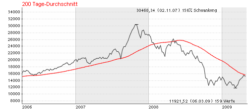 Bärenbulle Mai 1, 2009 Wo dus schon ansprichst,auf Bloomberg kam heute morgen, dass irgend ein Index ,ich weis nich mehr welcher (s&p oder FTSE oder sonst einer),is auch egal welcher weils nur um die Sache an sich geht: also dieser Index hat seinen 200 Tage GD überschritten was dazu führt, dass erstens die shorties massenweise glattstellen, weild as wohl ein markanter Stopp war und auf der anderen Seite gehn die longs rein weils ein markanter Einstiegspunkt is...eben alles viel Psychologie dabei Könnte der NASDAQ gewesen sein: Der Hang Seng hat's nicht geschafft (kleiner Abpraller): Dow und S&P sind noch etwas weiter davon entfernt. Wenn die es schaffen, dann wird der DAX sowieso brav und völlig willenlos wie immer folgen. Diesen Beitrag teilen Link zum Beitrag