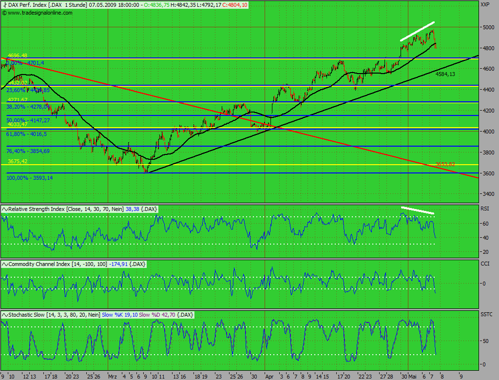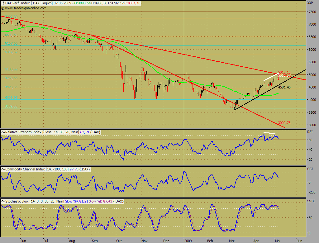Marktfrau Mai 4, 2009 Ich würde sagen, dass da einige (starke) Widerstände auf den DAX zukommen: - Fibonacci Retracement 50% (starker Widerstand) - 200 Tage Linie (mittelstarker Widerstand) - lineare Abwärtsbewegung vom AZH von ca. 8100 Index-Pukten (langfristiger Abwärtstrend = starker Widerstand) - zudem gehen die Indikatoren nach dem langen (sauberen) Aufwärtstrend der letzten Wochen in den überkauften Bereich - wir erreichen zudem langsam den oberen Bereich des mittelfristigen Trading-Kanals Sobald der DAX an Schwung verliert, geht's wieder nach unten (4400-4700). Nach unten sind nun aber auch einige Unterstützungen vorhanden, die die Abwärtsbewegung abfedern dürften. Nach meiner Einschätzung bleiben wir in den nächsten Monaten in diesem (breiten) Trading-Kanal. Die Wirtschaft ist in diesen Tagen zu einer politische Bühne geworden und Spekulationen sind (für mich) zu einem Glückspiel geworden. Deshalb stehe ich auch seit Monaten an der Seitenlinie. Trotzdem wage ich jetzt wieder einen Short - Einstieg am Widerstand. Dax und Dow legen 21:55 Uhr noch mit Volldampf zu. Bisher sind alle Widerstände geknackt worden, als wären sie gar nicht da. Ich sehe eher eine Tendbeschleunigung je mehr Widerstände geknackt werden. Alles andere sind Hoffnungen verspäteter Bären, die eine Trendwende verpaßt haben. Diesen Beitrag teilen Link zum Beitrag