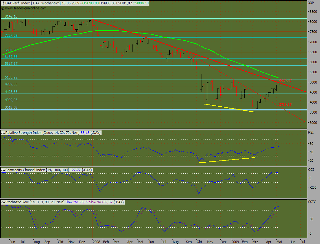 opes Mai 4, 2009 Dax und Dow legen 21:55 Uhr noch mit Volldampf zu.Bisher sind alle Widerstände geknackt worden, als wären sie gar nicht da. Ich sehe eher eine Tendbeschleunigung je mehr Widerstände geknackt werden. Alles andere sind Hoffnungen verspäteter Bären, die eine Trendwende verpaßt haben. Seh ich auch so.Dow gibt die Richtung vor und der kennt momentan nur eine. Außerdem wirken gerdae solche Dinge wie Erreichen des 200 Tage GD als Trendbeschleuniger. Bin aufjedenfall bullish bis 9000 im Dow. Diesen Beitrag teilen Link zum Beitrag