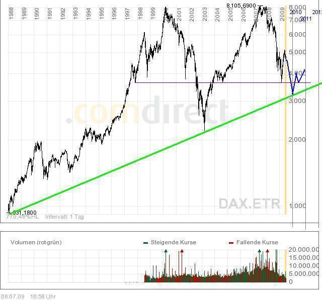 hugolee Juli 8, 2009 · bearbeitet Juli 8, 2009 von hugolee Der Dax-Index wird meiner Meinung nach bis ca 3650Punkten korrigieren. (siehe Bild) Dort könnte es zu einer Richtungswechsel kommen. Allerdings glaube ich, dass dort noch nicht Schluss ist mit der Korrektur, sondern, dass der Dax bis auf den langjährigen Aufwärtstrend seit 1988 aufsetzt um von dort aus wieder nach Norden aufzubrechen. So, und nun könnt Ihr auf mich einprügeln. hugolee Diesen Beitrag teilen Link zum Beitrag