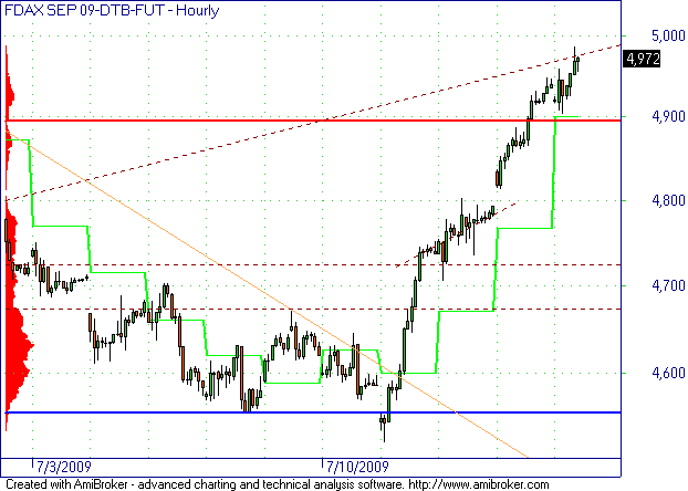 Entweder es kommt nun zu einer kleinen Zwischenkonsolidierung und das schon angesprochene Gap bei ca. 4800 wird geschlossen. Oder aber der Kurs geht durch die Decke bis 5200 in den nächsten Tagen.