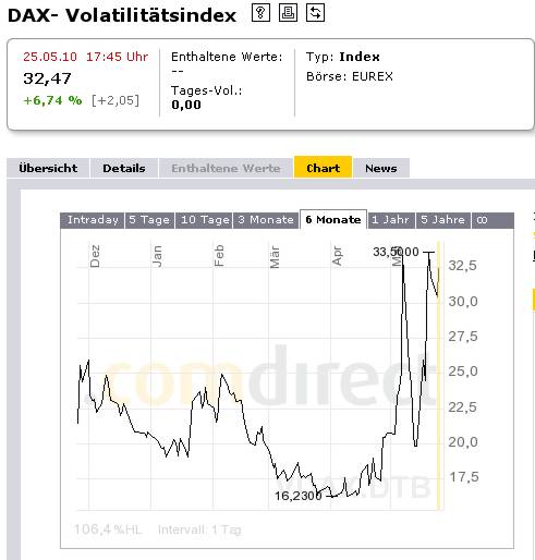 Archimedes Mai 26, 2010 Das sollte mehr ein allgemeiner Kommentar zur Volatilität sein. Immerhin ist der VDAX in 6 Wochen von 16 auf 32 gestiegen also satte 100%. https://isht.comdire...ype=CONNECTLINE Diesen Beitrag teilen Link zum Beitrag