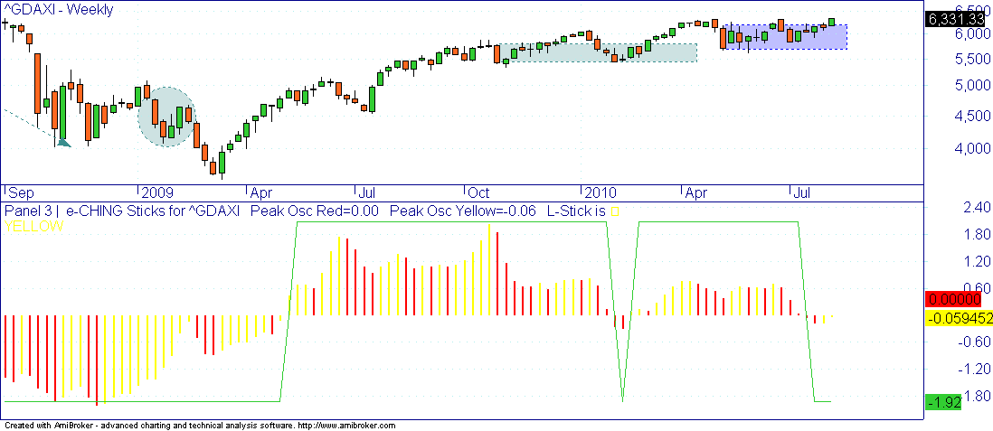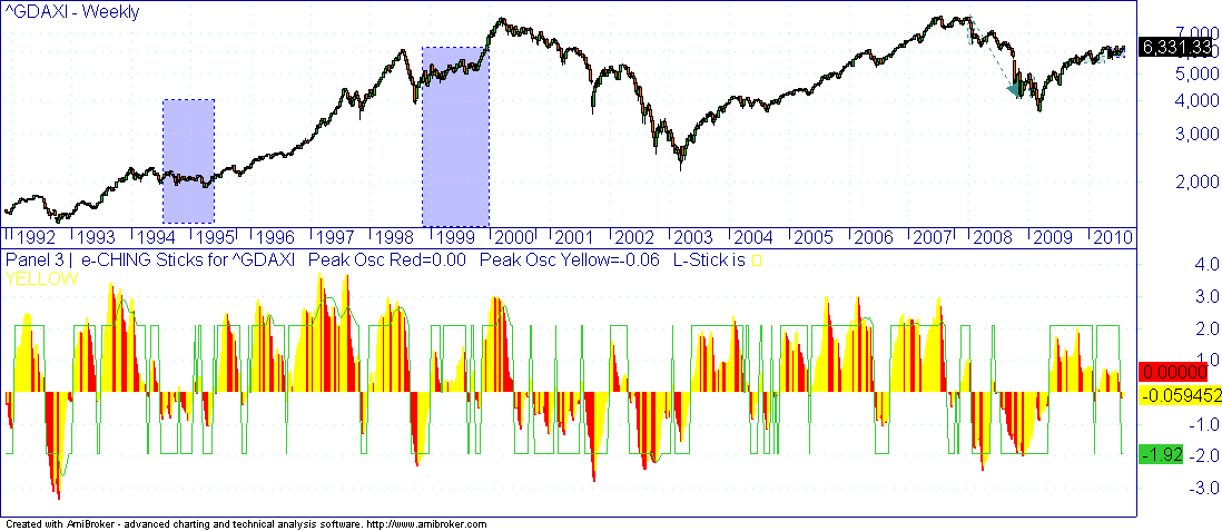 H.B. August 4, 2010 Wirtschaft und Unternehmen senden z.Z. positive und ermutigende Signale aus, die alle Menschen erfreuen sollten, auch wenn sie nicht Unternehmer oder Aktionär sind. Na, dann leben wir wohl in unterschiedlichen Welten. Ich sehe die Renditen der Staatsanleihen kontinuierlich fallen, ich sehe tolle Q2-Ergebnisse, ich sehe einen Wirtschaftsminister, der in Jubelstimmung ist und ich sehe Unternehmenschefs, die keine Prognosen abgeben mögen. Dann sehe ich auf den Kalender und stelle fest: es ist August. Was wird wohl passieren, wenn die Unternehmens-Berichte durch sind? Cognitrend hat heute berichtet, dass die Profis mehrheitlich skeptisch gestimmt sind und die aktuellen Niveaus zum Verkauf genutzt haben. Das bringt mich zur Frage: Wer tritt jetzt als Käufer auf? Smart Money, US-Money oder spekulatives Geld? Smart Money ist sicherlich seit geraumer Zeit "an Board" und wird sich spätestens in der letzten Korrektur eingedeckt haben. US-Money: vielleicht. Da stellt man sich dann schon die Frage, ob die aktuellen Wechselkurs den europäischen Markt noch interessant erscheinen lassen. Bleibt spekulatives Geld, Menschen also, die die Tagespresse lesen, auf Charts schauen und "trendfolgend" einsteigen. Schauen wir uns den vermeintlichen Trend doch einmal an. Das ist der Wochenchart des DAX. Die Markttechnik spricht eine deutliche Sprache. Tradingrange nach oben verlassen (Wochenschlußkurs muss abgewartet werden. es könnte noch eine Entwicklung analog der Wochen vom 26.06. passieren). Kurzfristig könnten also durchaus (auch der saisonal verminderten Liquidität geschuldet) weitere Preisanstiege kommen. Aber ist das ein strategisches Kaufsignal? Eine erste Antwort gibt der im chart eingezeichnete Ching-Indikator, Der hat nämlich eine sehr seltene Divergenz zum Preisverlauf aufgebaut. Wenn man sich den DAX nämlich etwas längerfristig anschaut, dann erkennt man 1. den derzeit "fleischlosen" Verlauf des Preischarts, 2. die verblüffende Neutralität des Indikators, die wir nur 1994/5 und 1999 in dieser Form vorfinden. 3. eine sehr nachhaltige und ausgeprägte Divergenz des Indikators seit etwa einem Jahr. Das muss nichts heißen. Im Zusammenspiel mit den oben genannten chartfremden Indikationen ist aus meiner Sicht die Fortsetzung der Seitwärtsphase wahrscheinlicher, als eine Wiederaufnahme der Bärmarketrallye. Ich halte Strategien, die ein nochmaliges Eintauchen in die Tradingrange antzpipieren, für zielführend. Diesen Beitrag teilen Link zum Beitrag