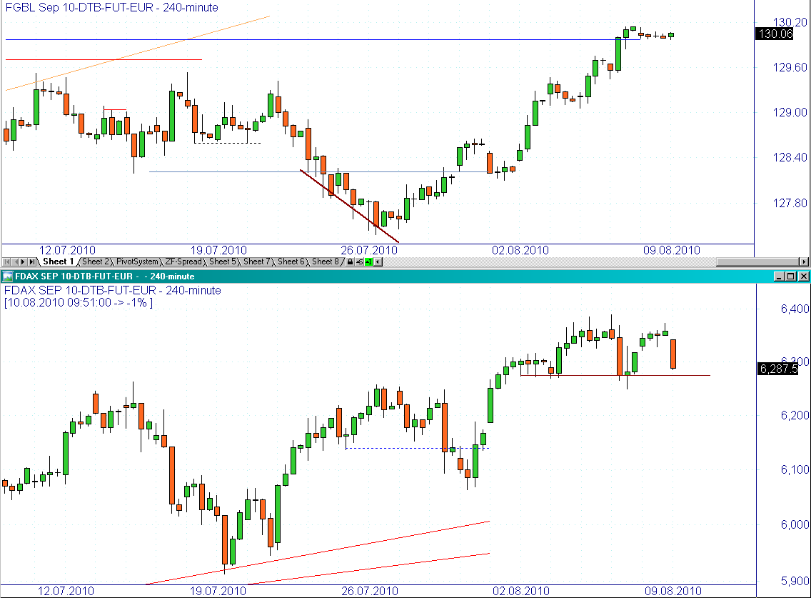 H.B. August 10, 2010 Hier mal der direkte Vergleich zwischen dem dt. Renten- und Aktienmarkt (im Intraday-4-Stunden-Chart) Während letzterer eine Top-Formation ausbildet, ist ersterer in eine neue Trendphase eingetreten. Diesen Beitrag teilen Link zum Beitrag