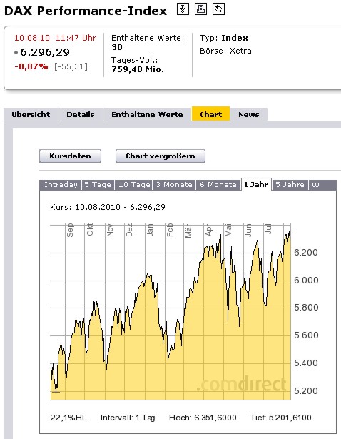 35sebastian August 9, 2010 Da pass ich mal ein paar Stunden nicht auf den Dachs auf. Und was macht er? Er springt hoch z.Z. 1,5% mehr, trotz Hochwasser und Miesmacher. Gibt es Gründe? Ich hörte gerade, dass der Export der deutschen Wirtschaft um fast ein Drittel im Vergleich zum Vorjahr gestiegen. Das ist schon eine Nummer. Die Anleger reagieren darauf. Ja, was macht man auch mit 10 jährigen Bundesanleihen, die mit 2,4% rentieren? Diesen Beitrag teilen Link zum Beitrag
